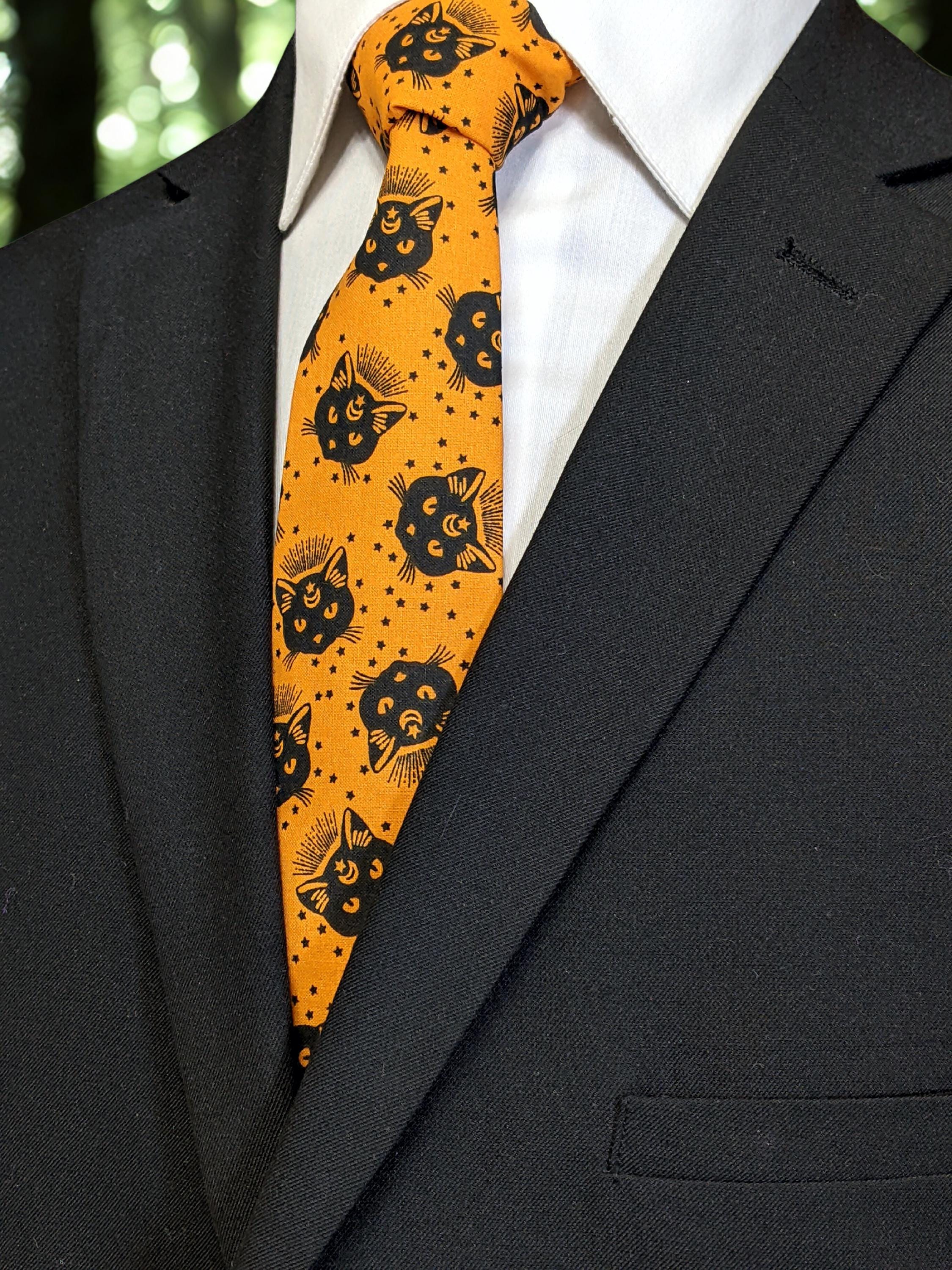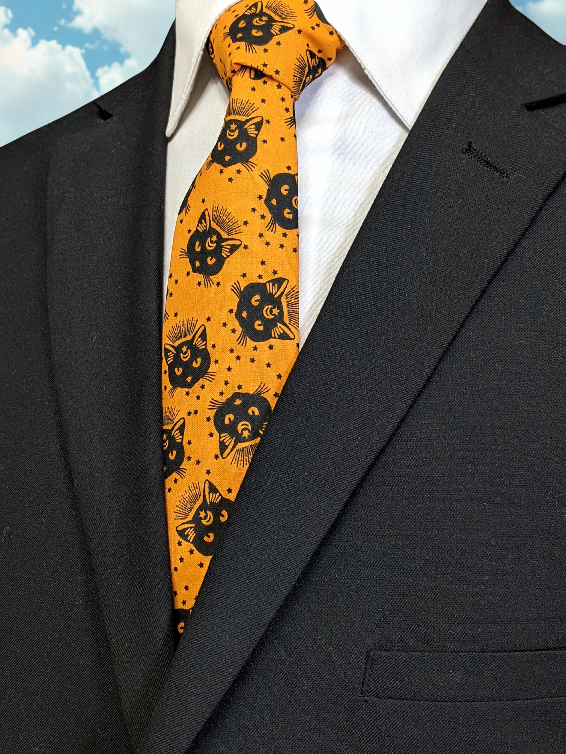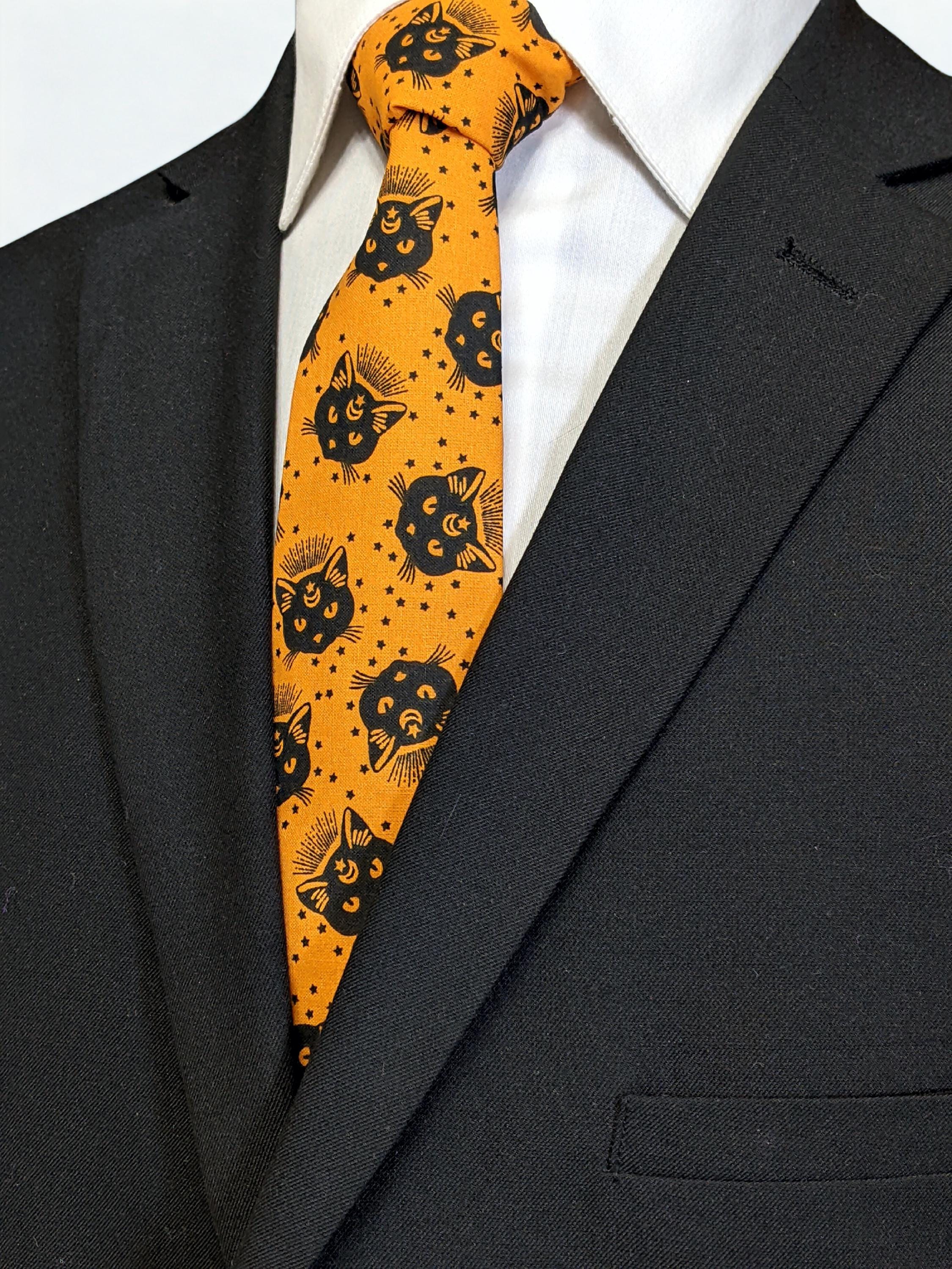 Description: "This Halloween cat necktie features an orange background with an all-over black cat head design. Made with 100% cotton, this handmade necktie by Ed's Neckties is perfect for adding a touch of spooky style to your Halloween outfit.