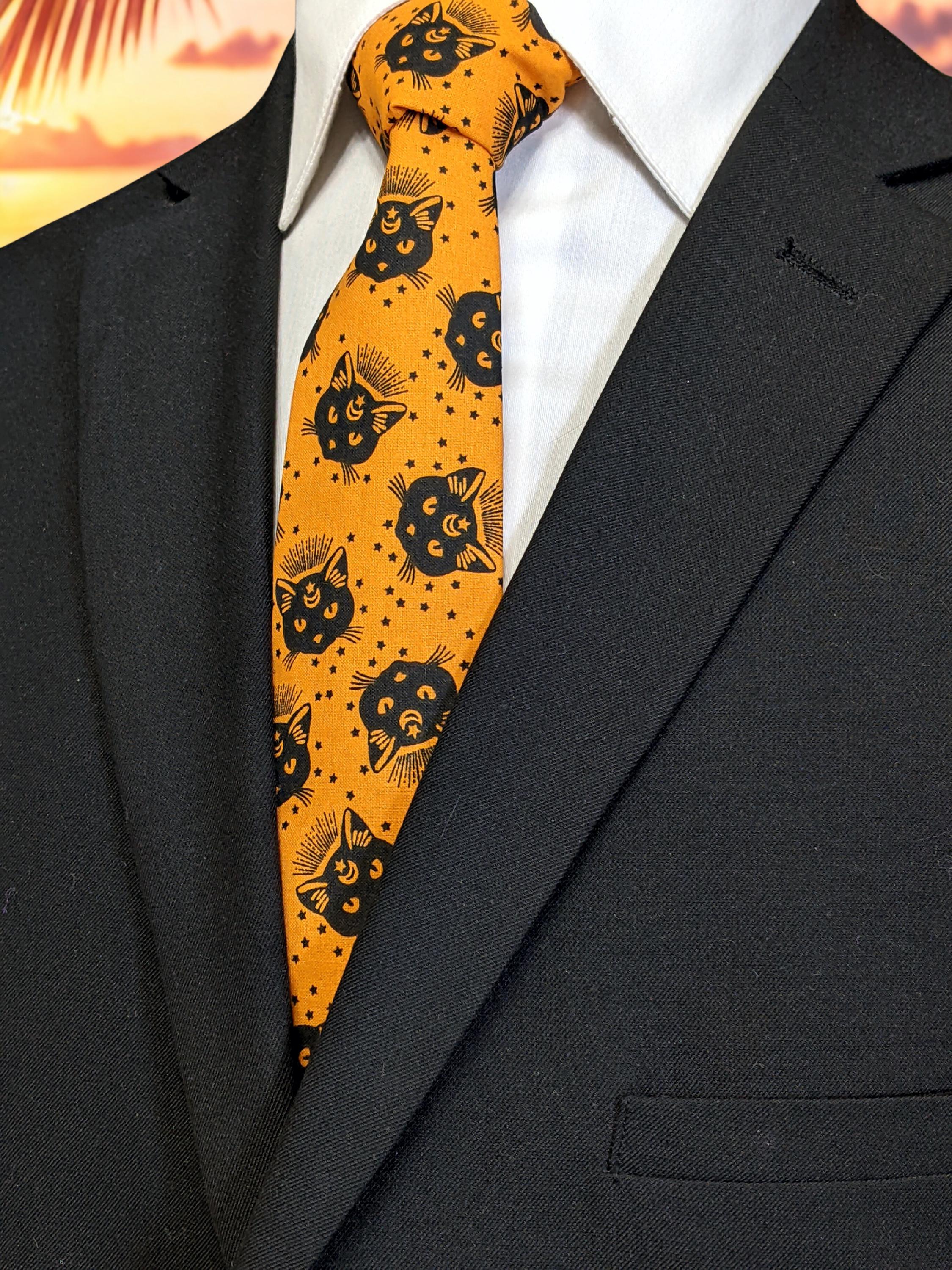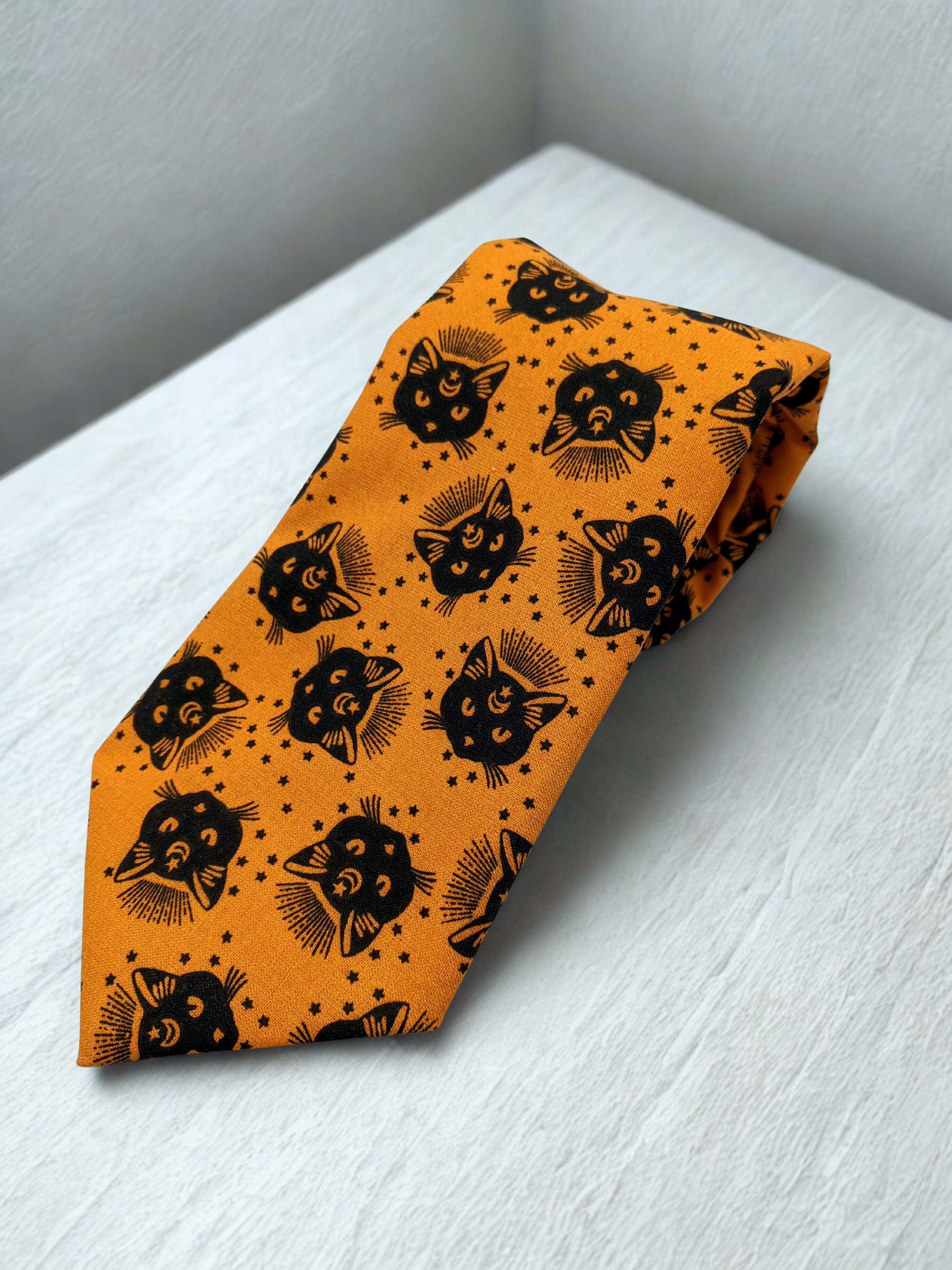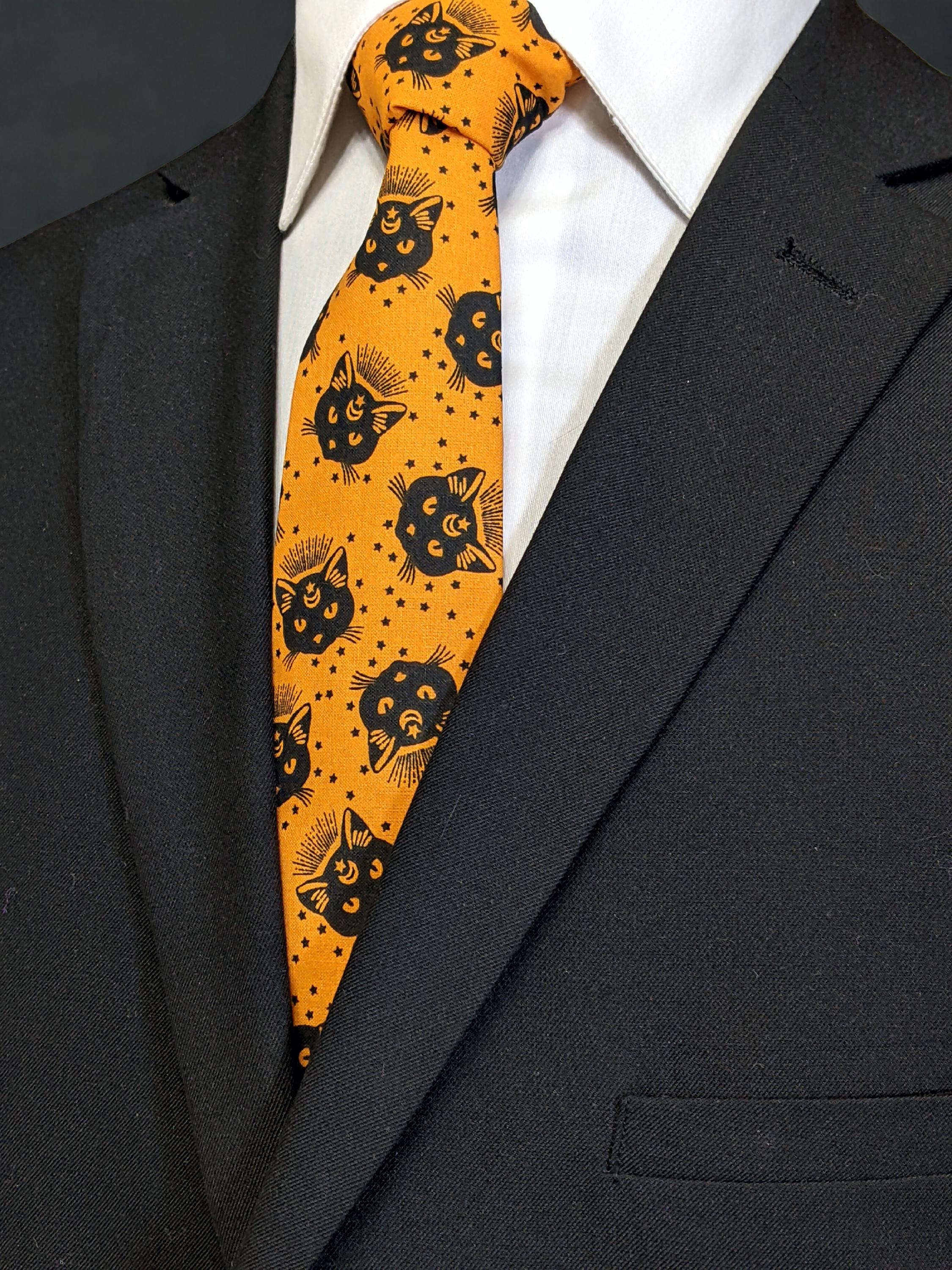 Description: "This Halloween cat necktie features an orange background with an all-over black cat head design. Made with 100% cotton, this handmade necktie by Ed's Neckties is perfect for adding a touch of spooky style to your Halloween outfit.
