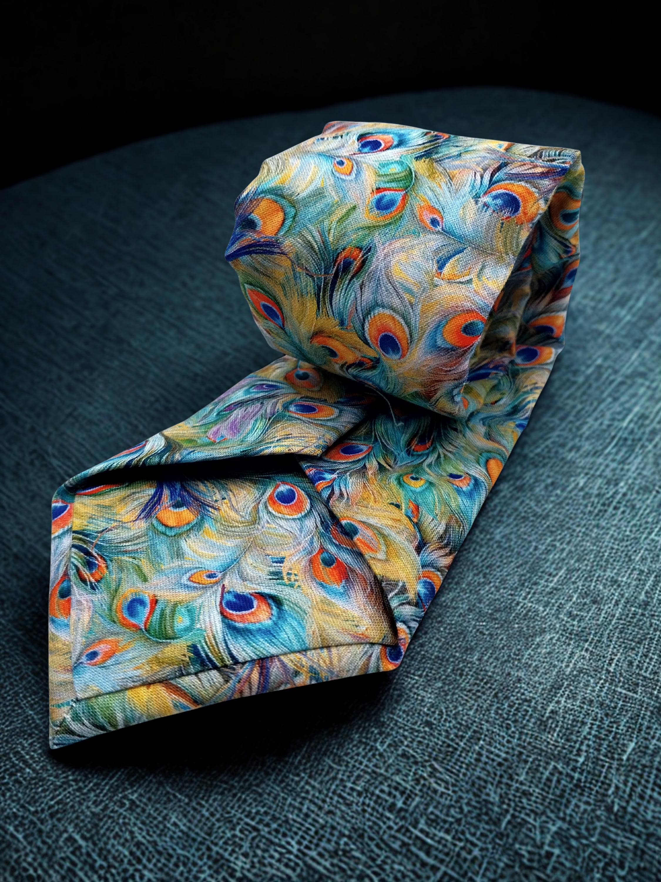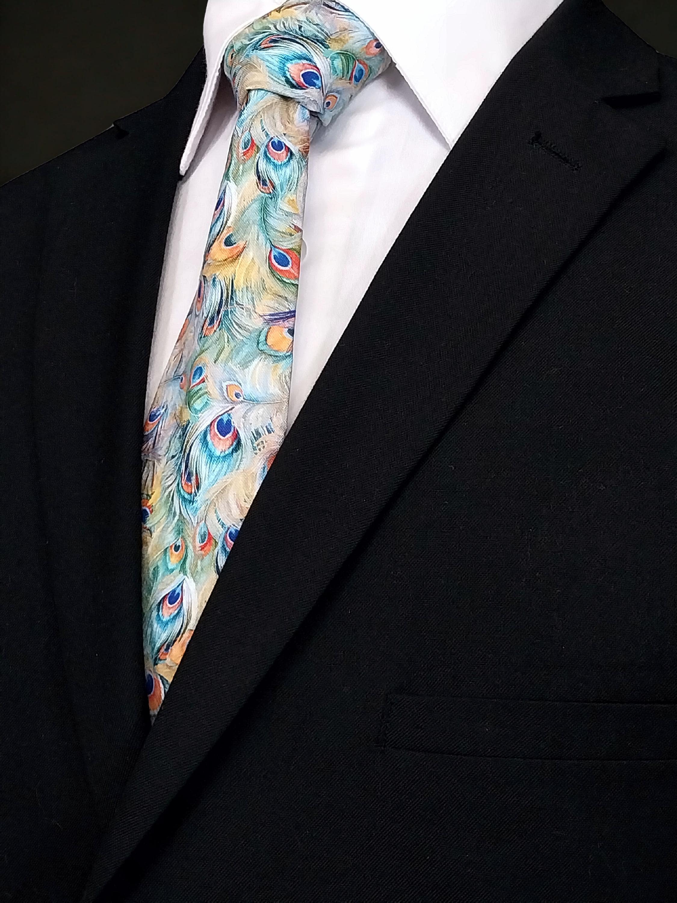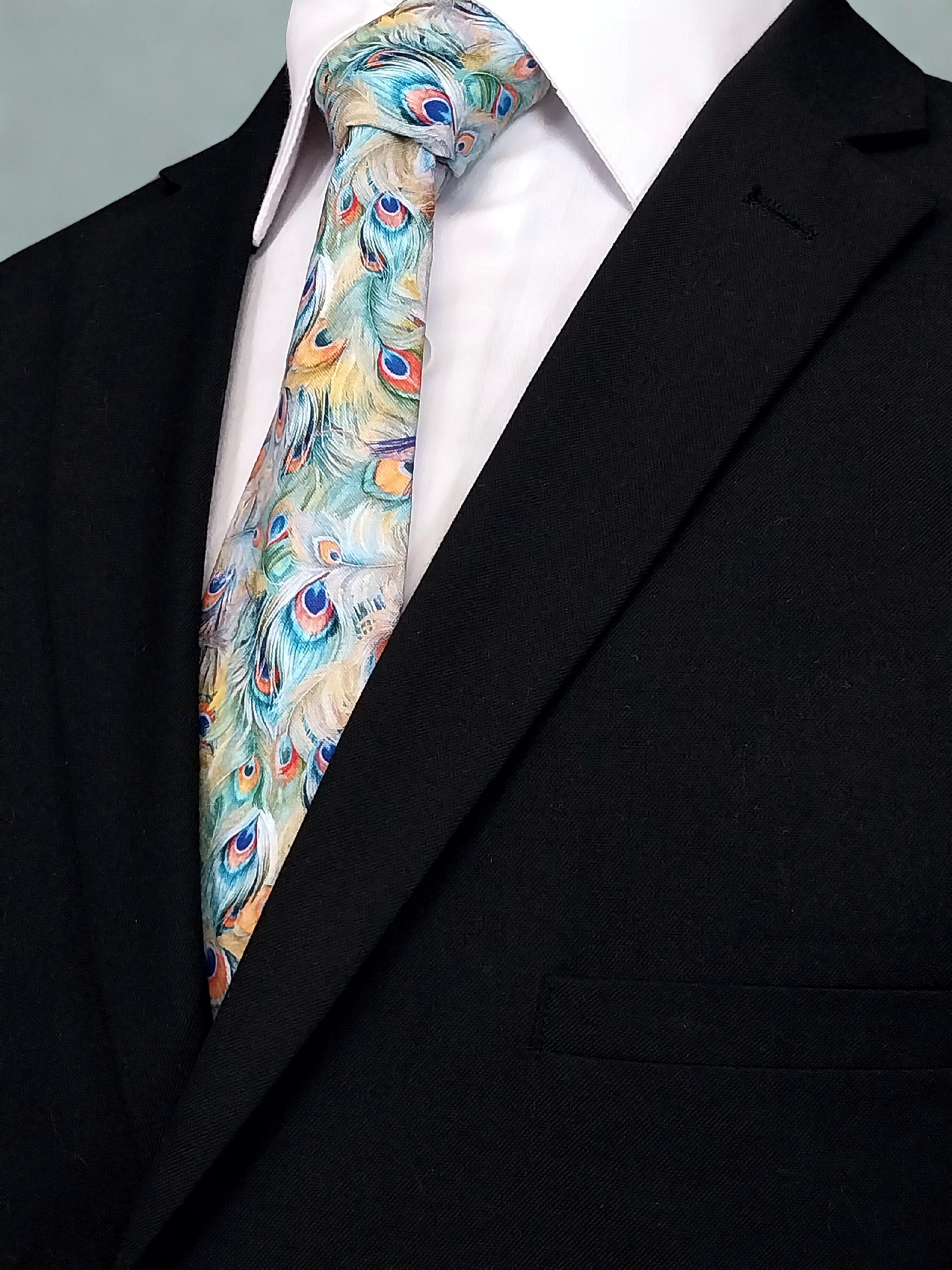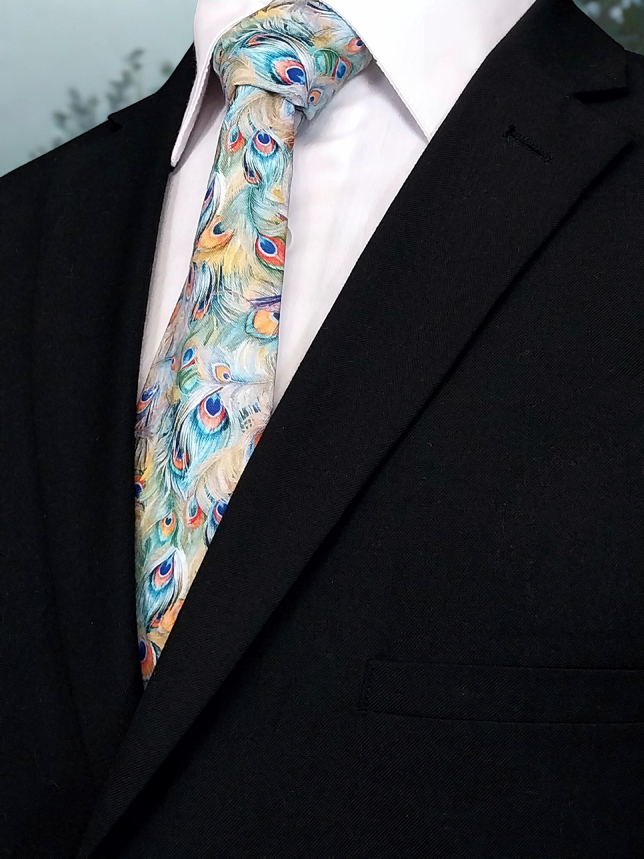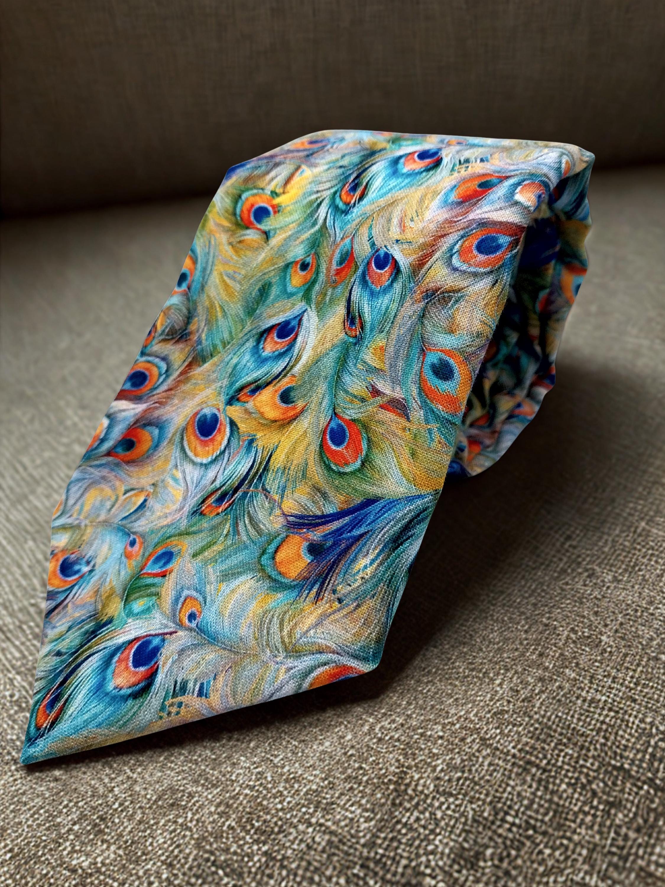This pastel peacock feather necktie will make the perfect gift for him. Features an allover peacock feather motif. Colors include: Shades oranges, greens, purples and blues.