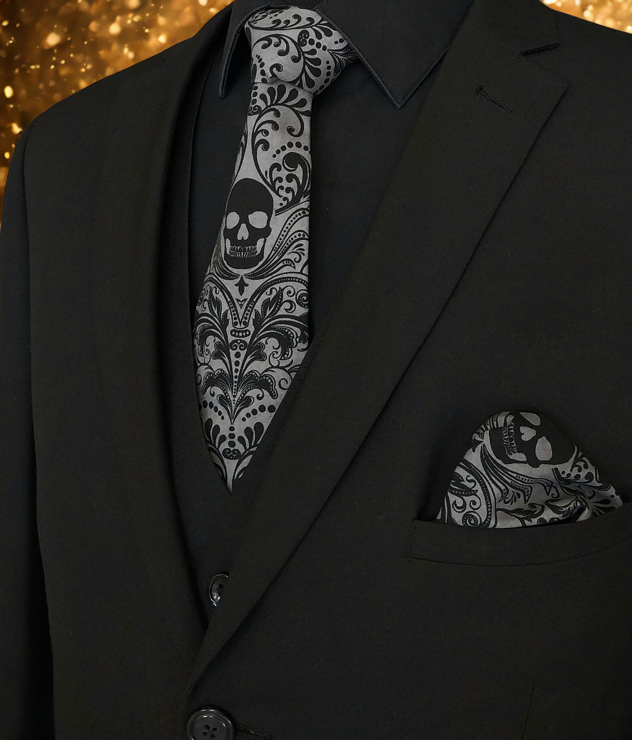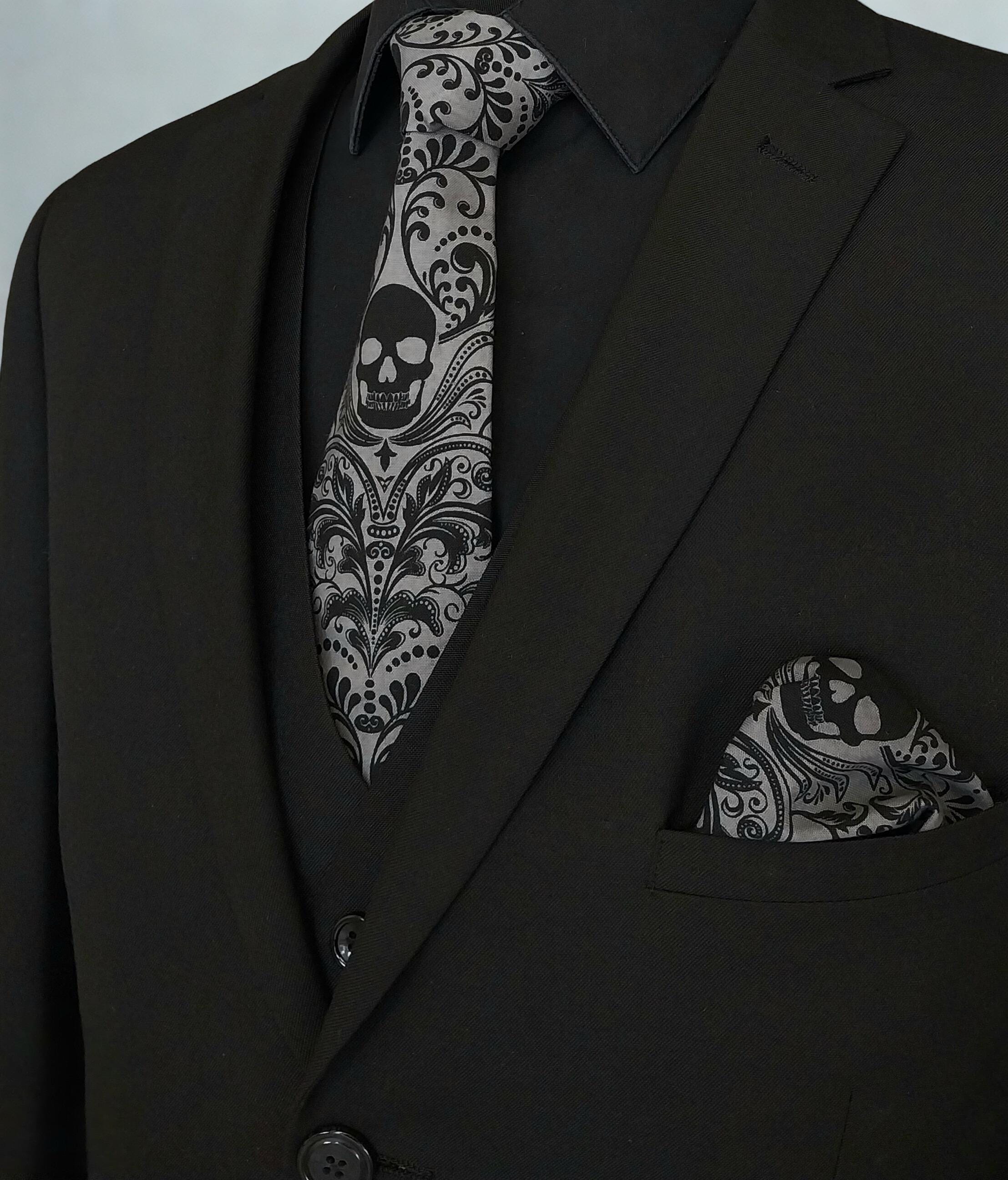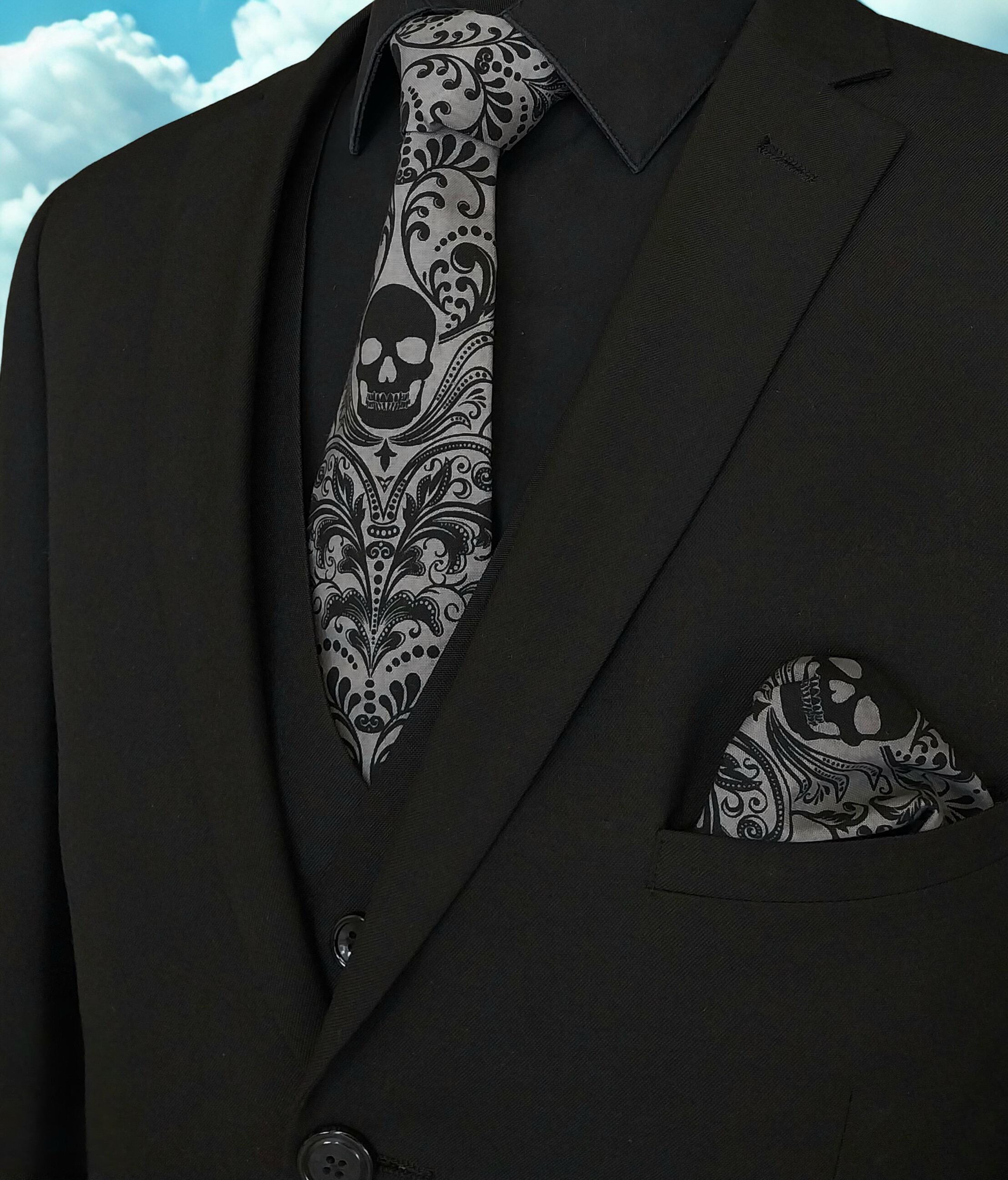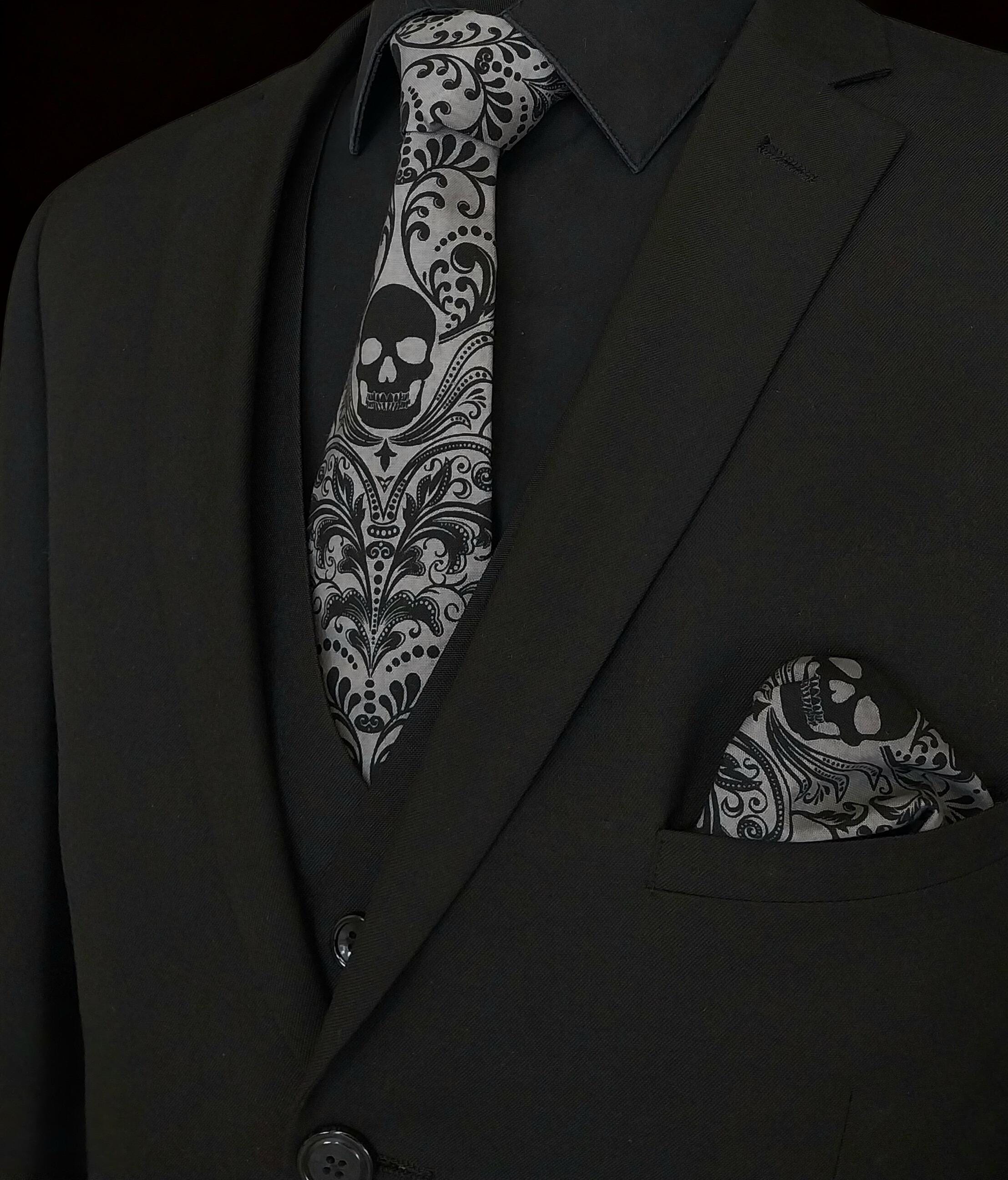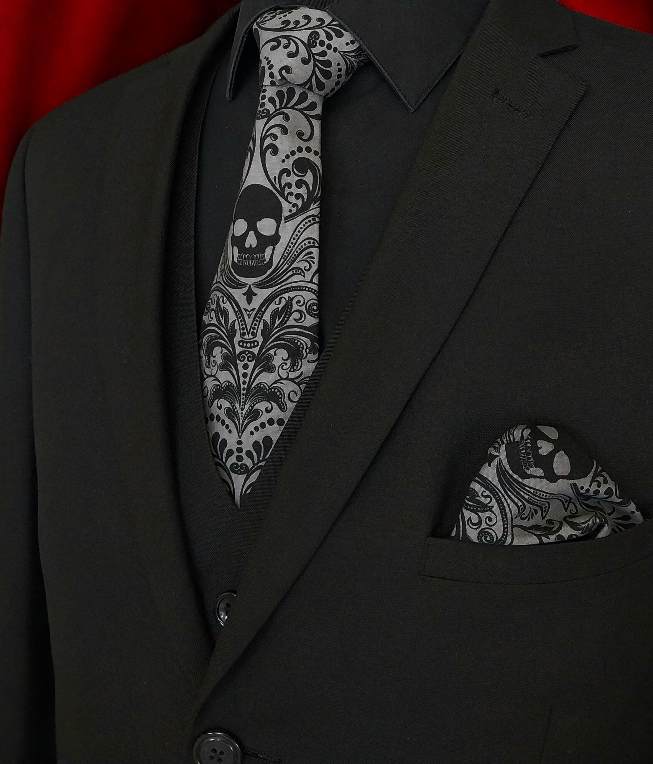 This goth skull tie features a light grey background with black skulls. Available as a skinny and an extra-long tie. Pocket squares available.