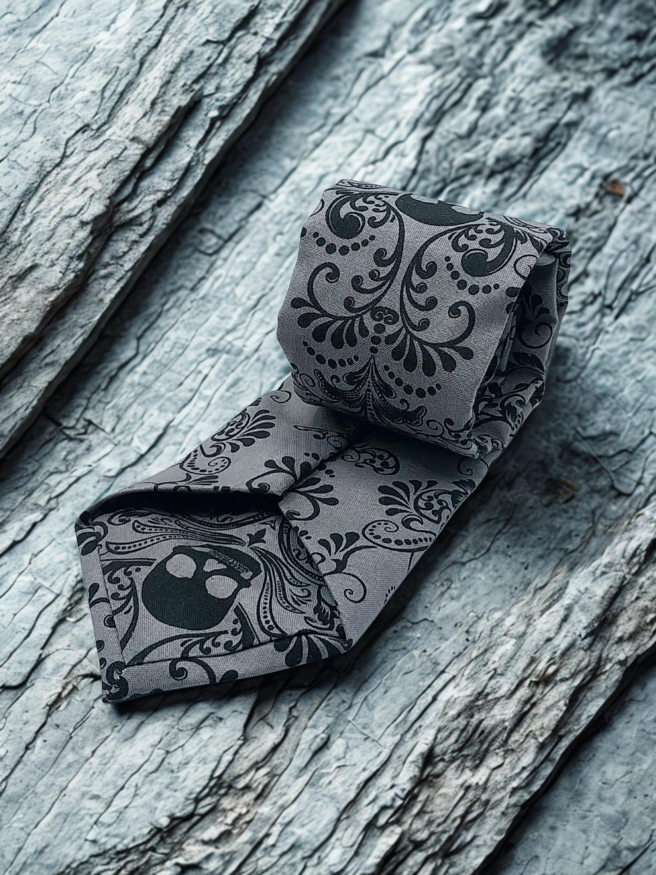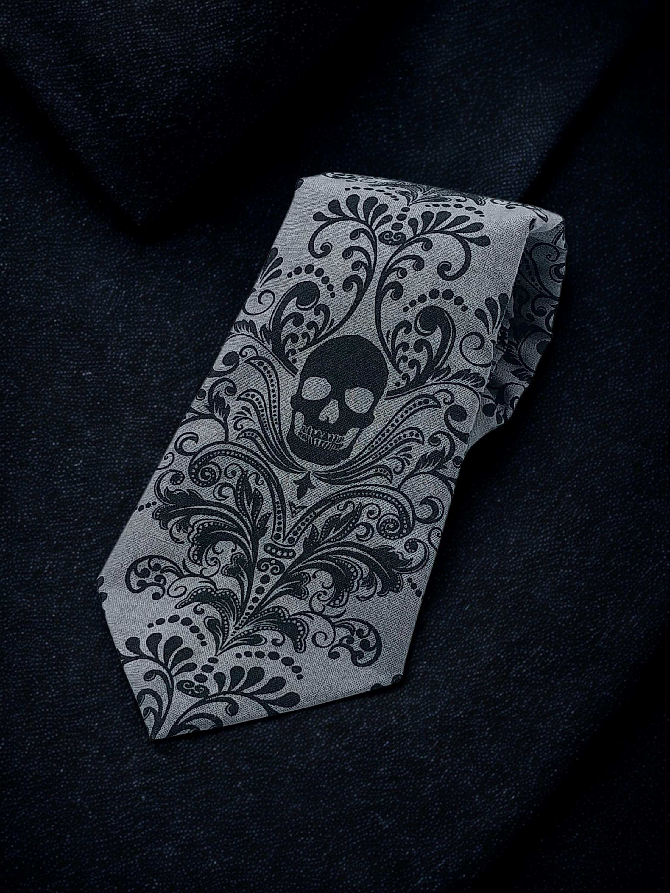 Light Gray with Black Skull Necktie: Handmade, Hand-Dyed Cotton Damask Gothic-Styled Accessory