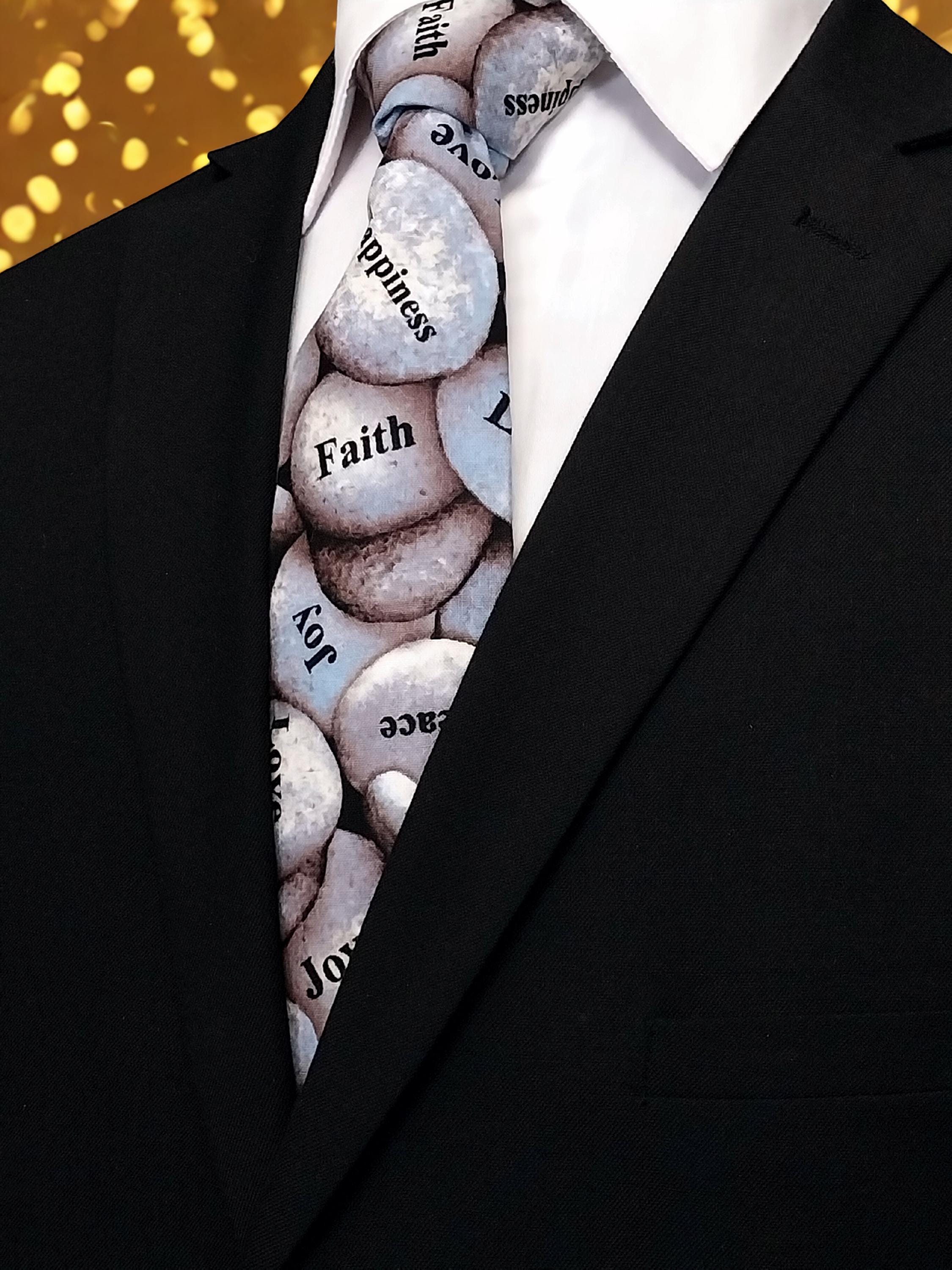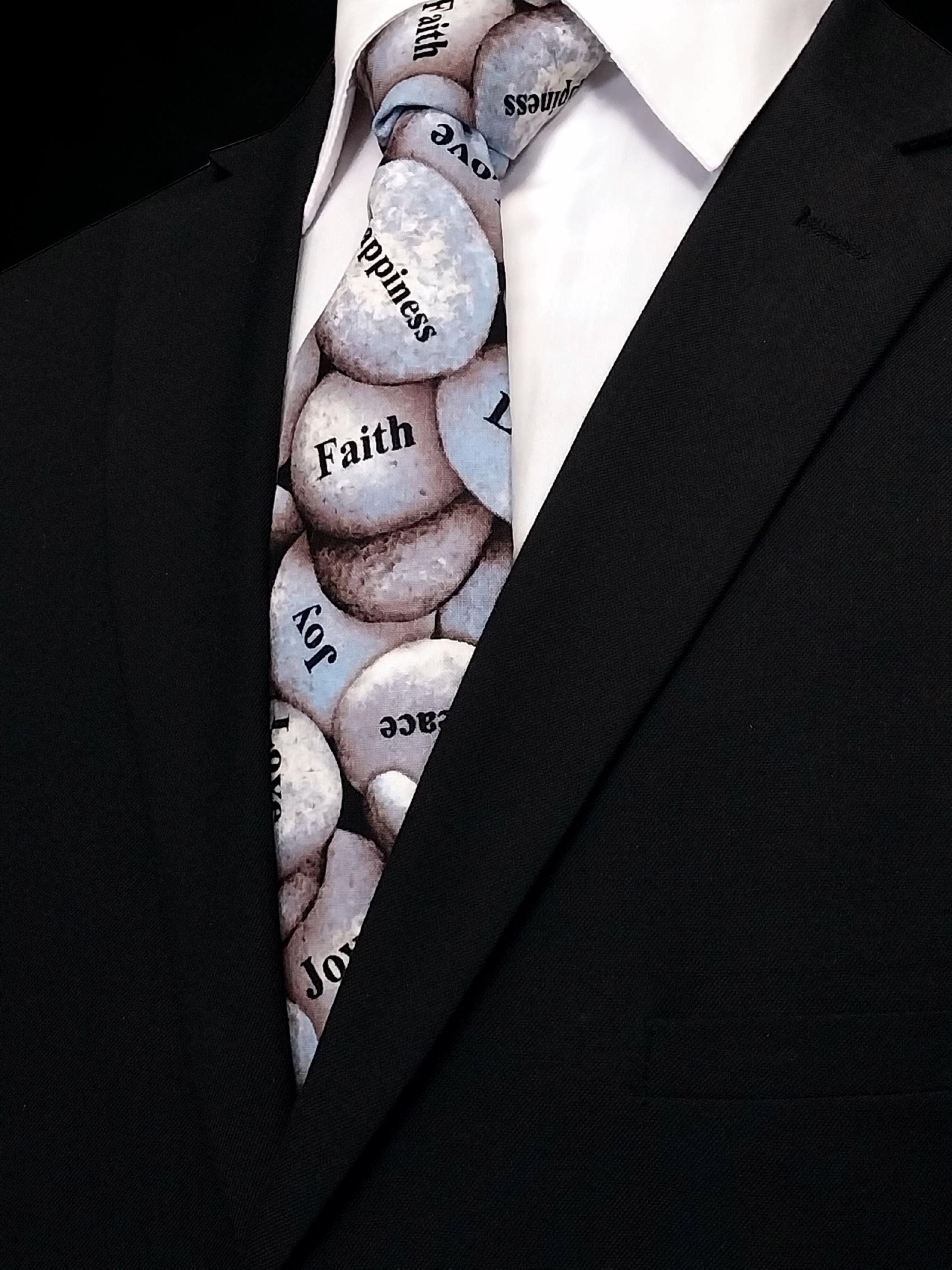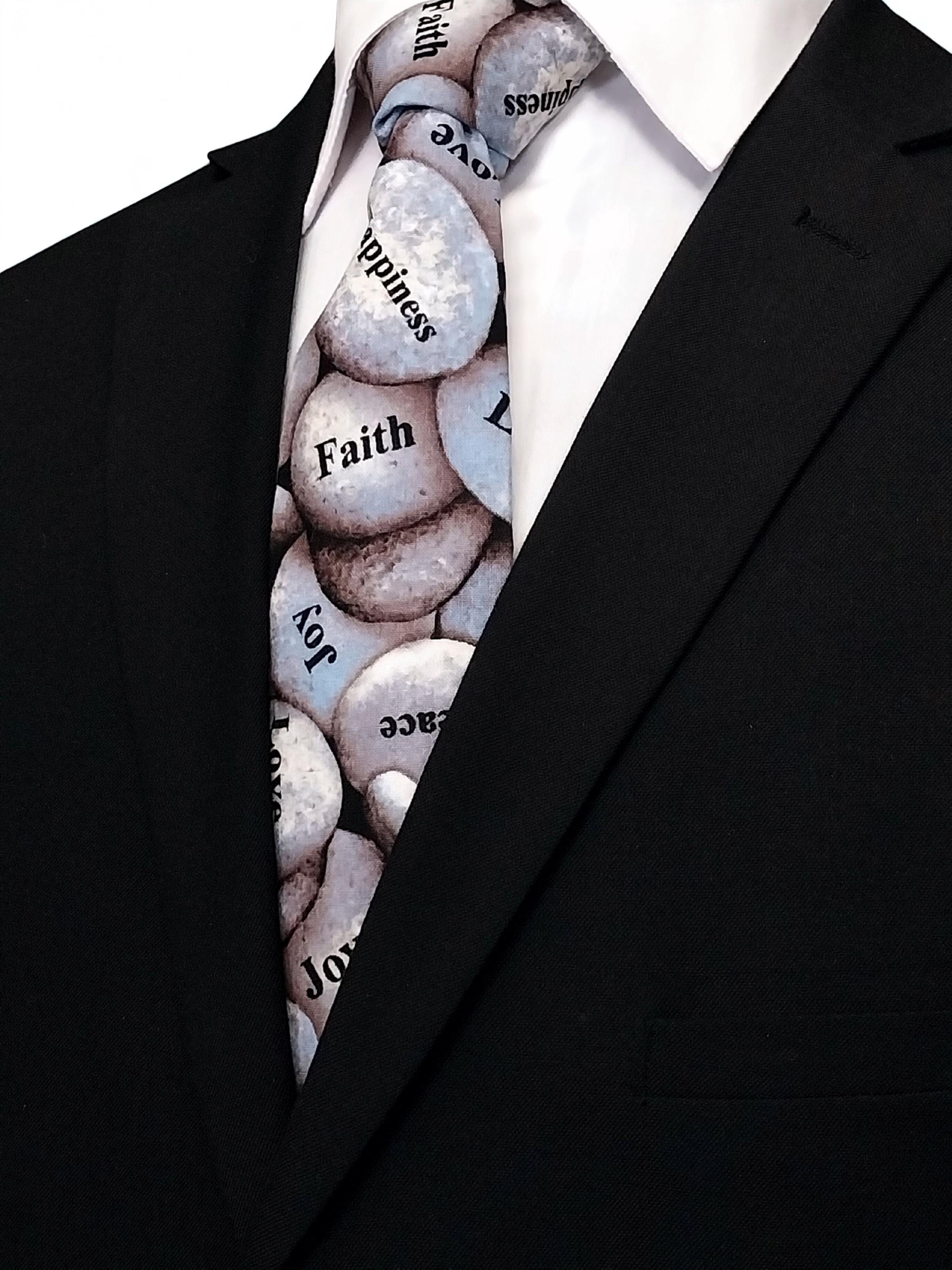 Faith religious Necktie. Perfect for Sunday Mass.. Features an allover rock pattern with sayings.