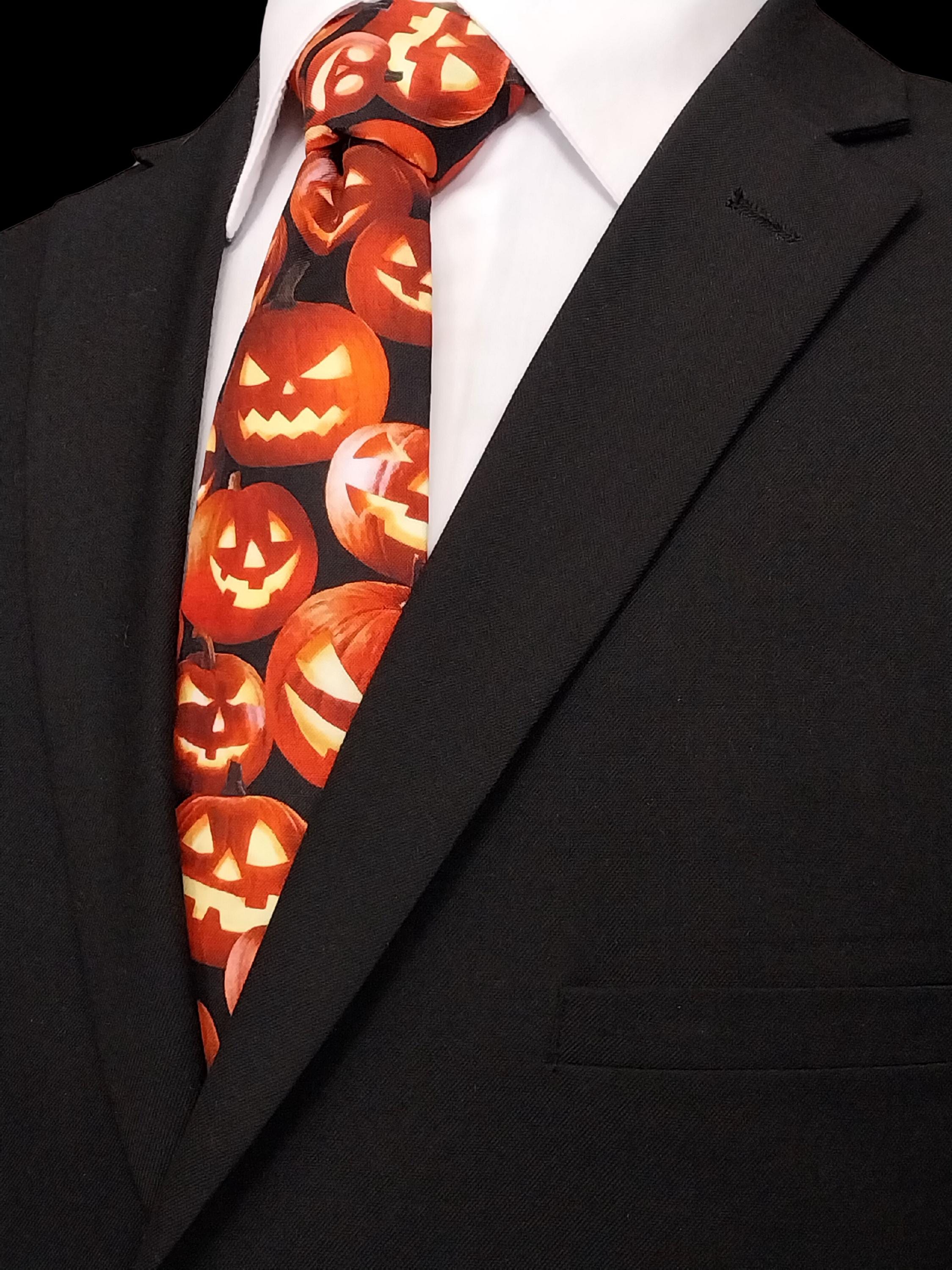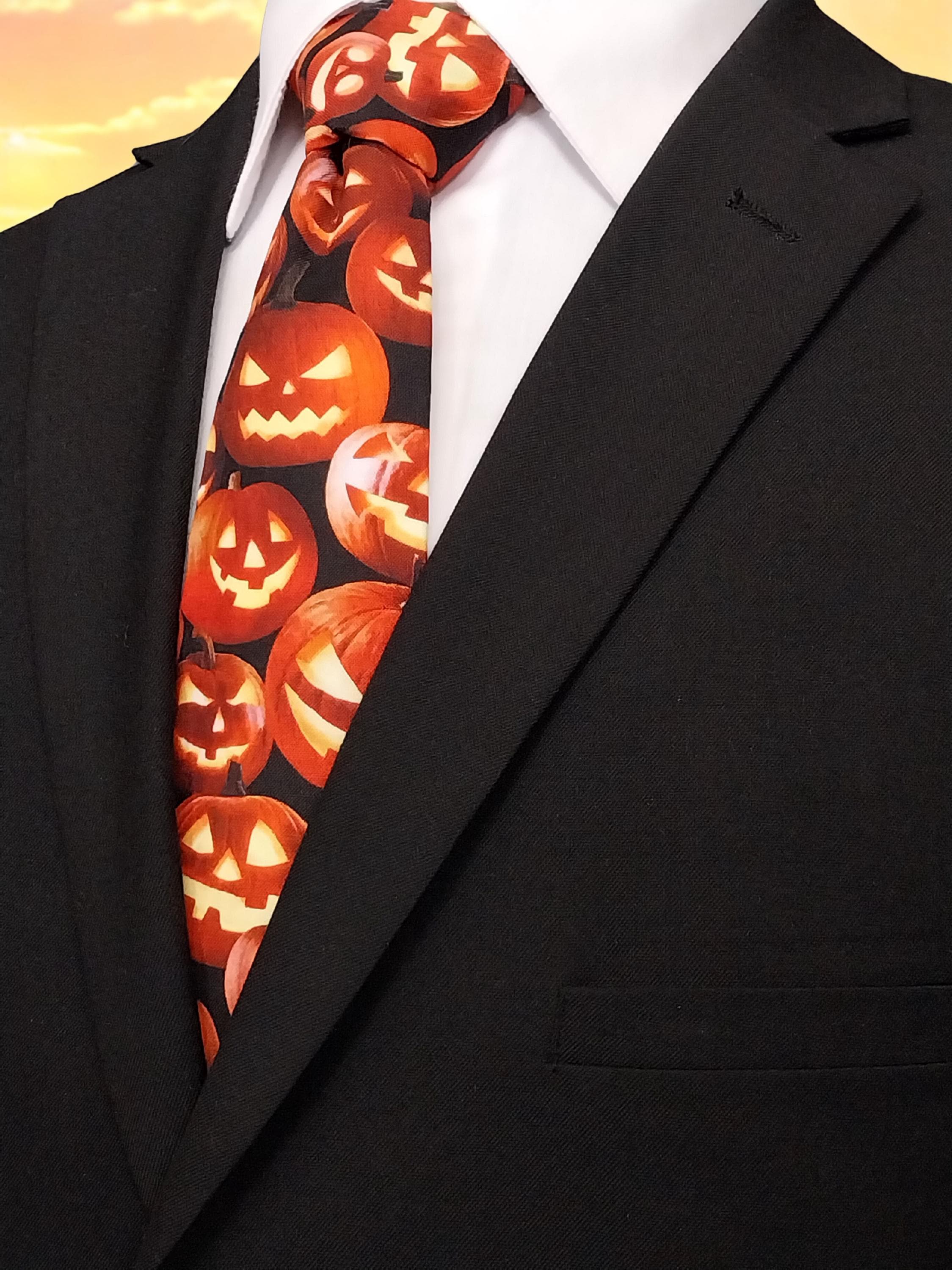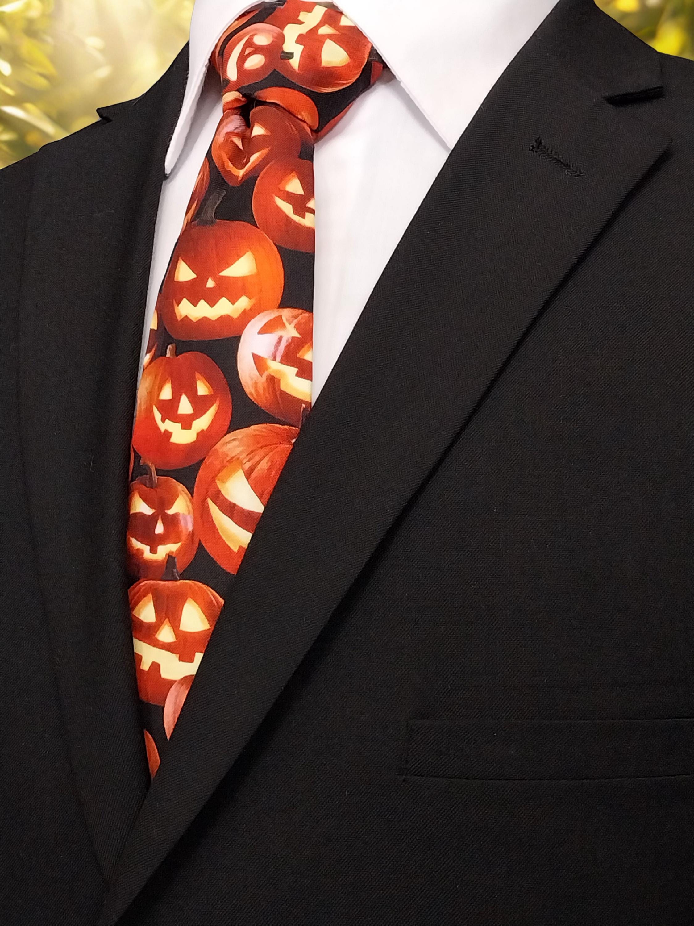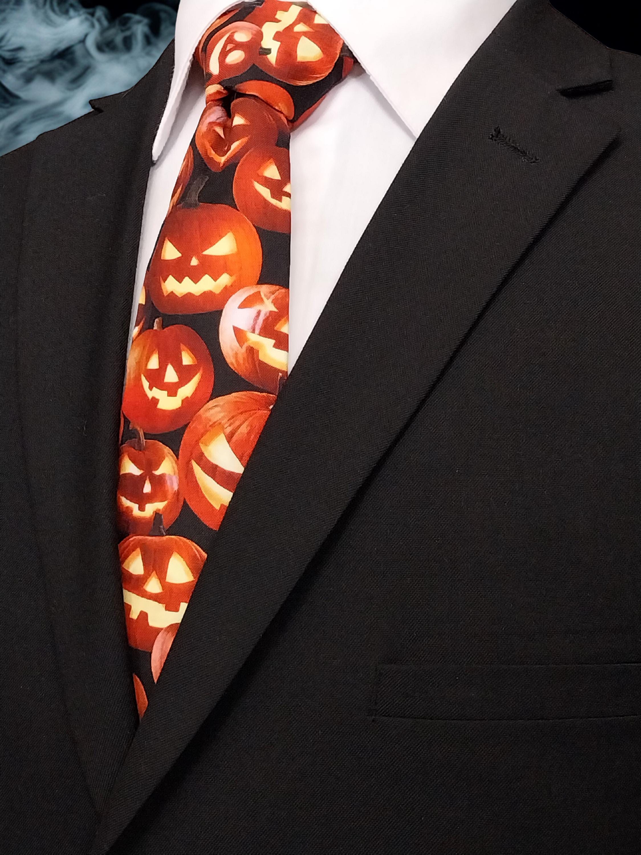 This Halloween pumpkin necktie will the perfect addition the office Halloween party. Features an allover pumpkin pattern. Available as child's necktie upon request.