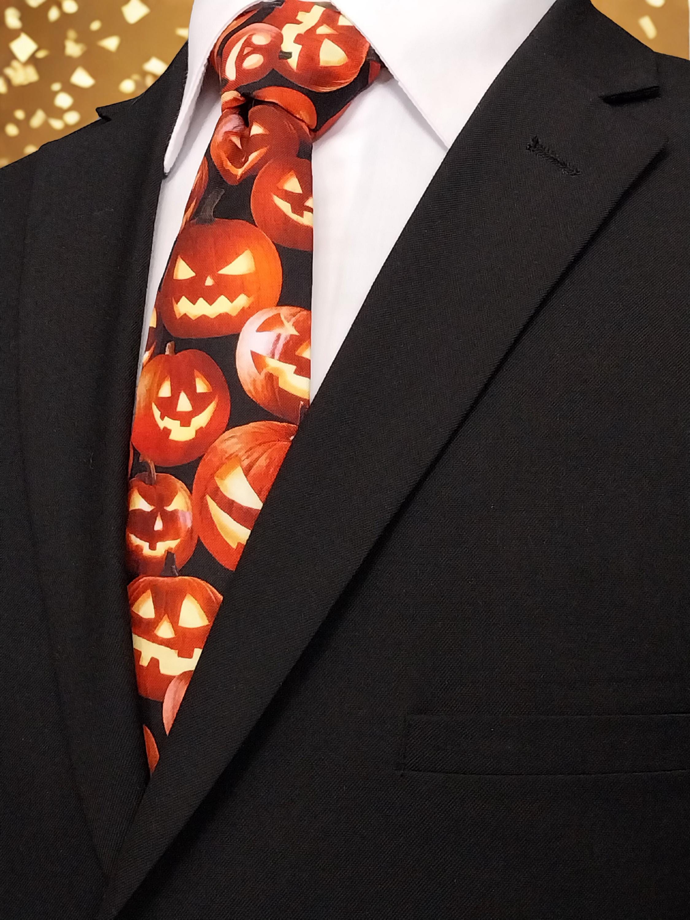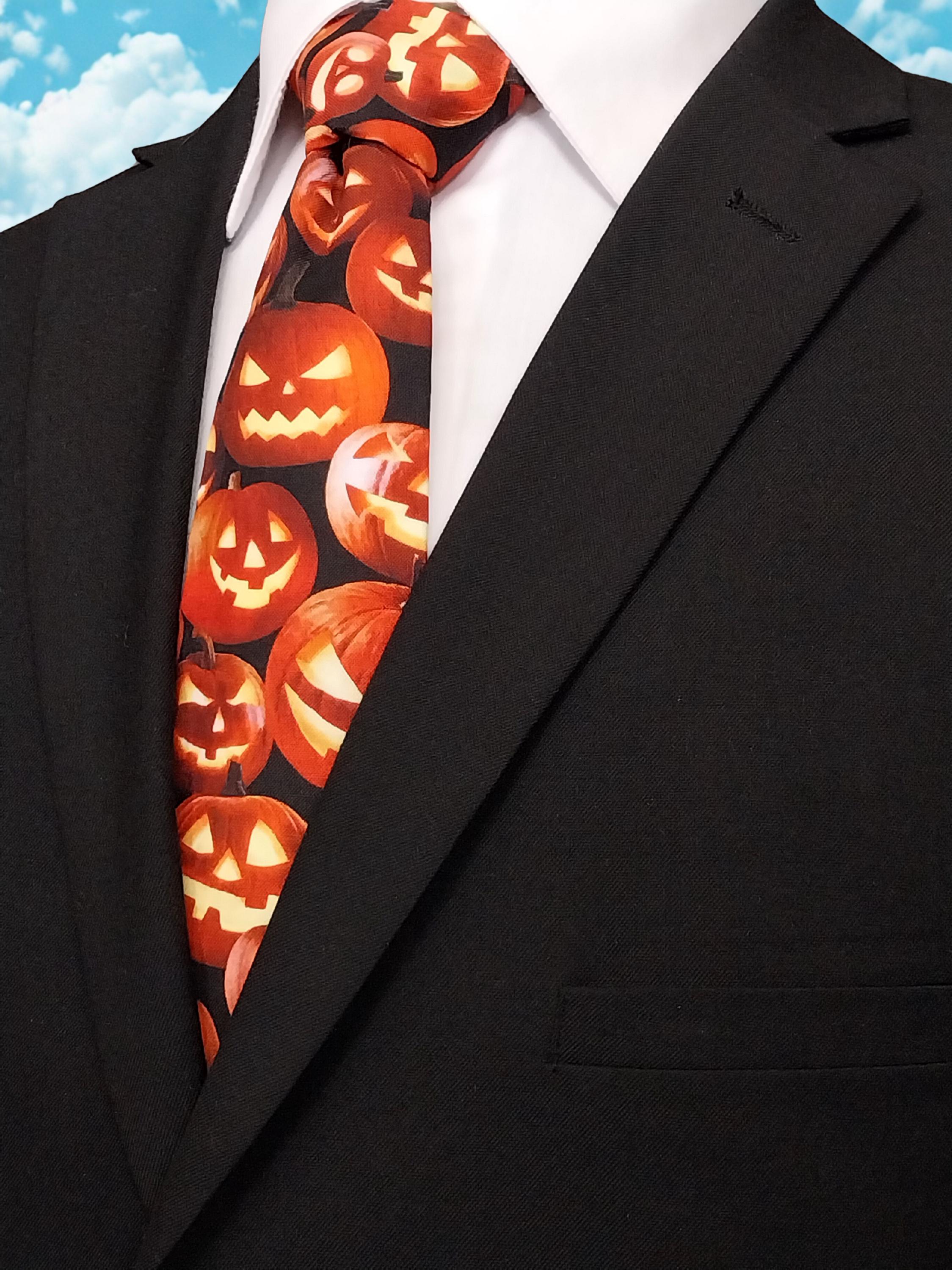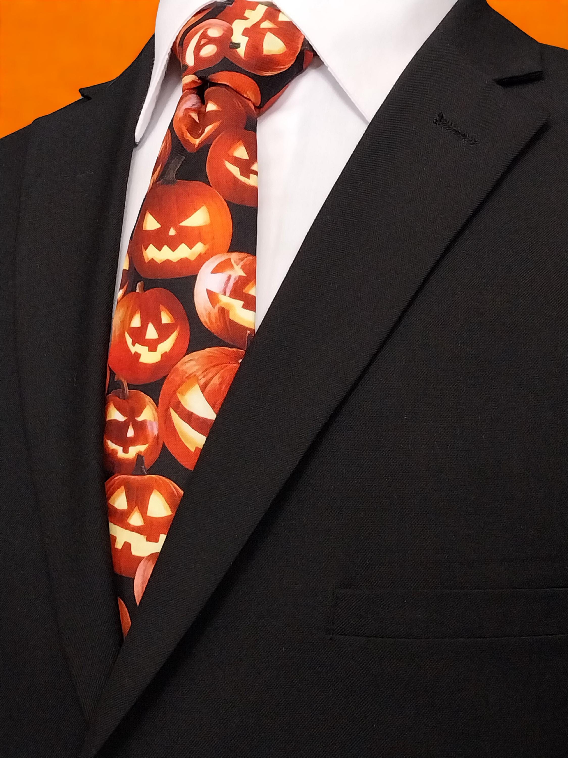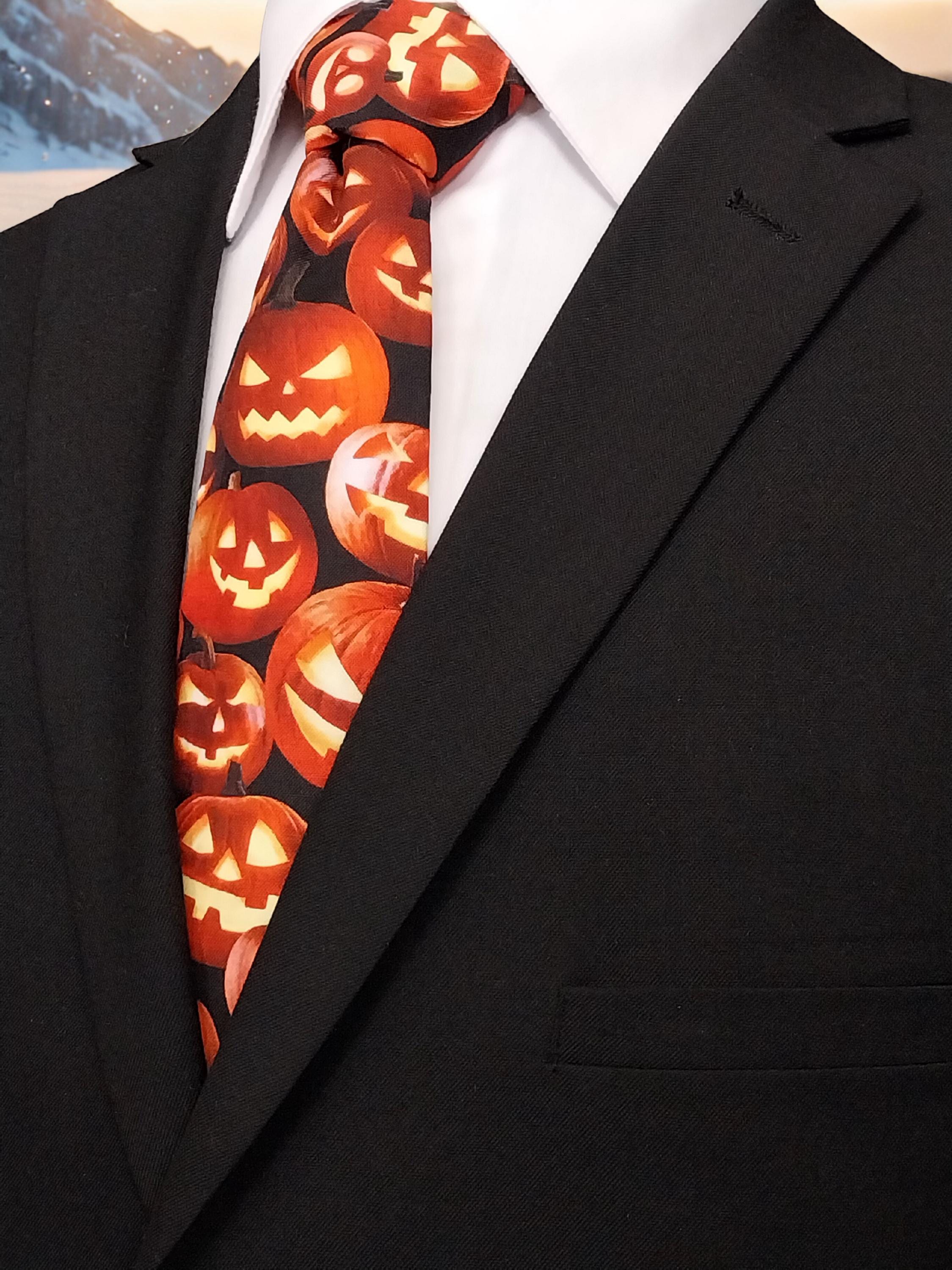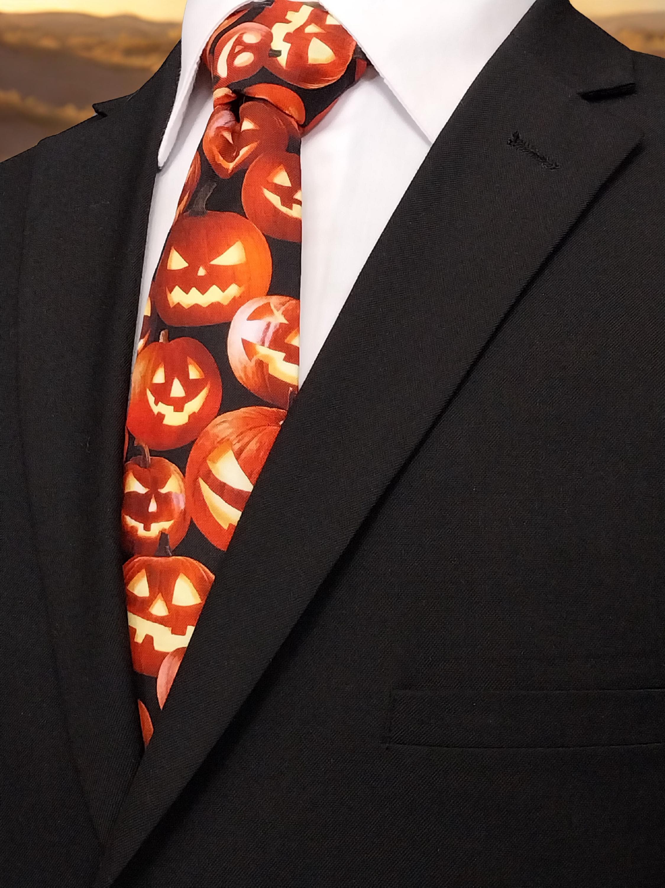 This Halloween pumpkin necktie will the perfect addition the office Halloween party. Features an allover pumpkin pattern. Available as child's necktie upon request.