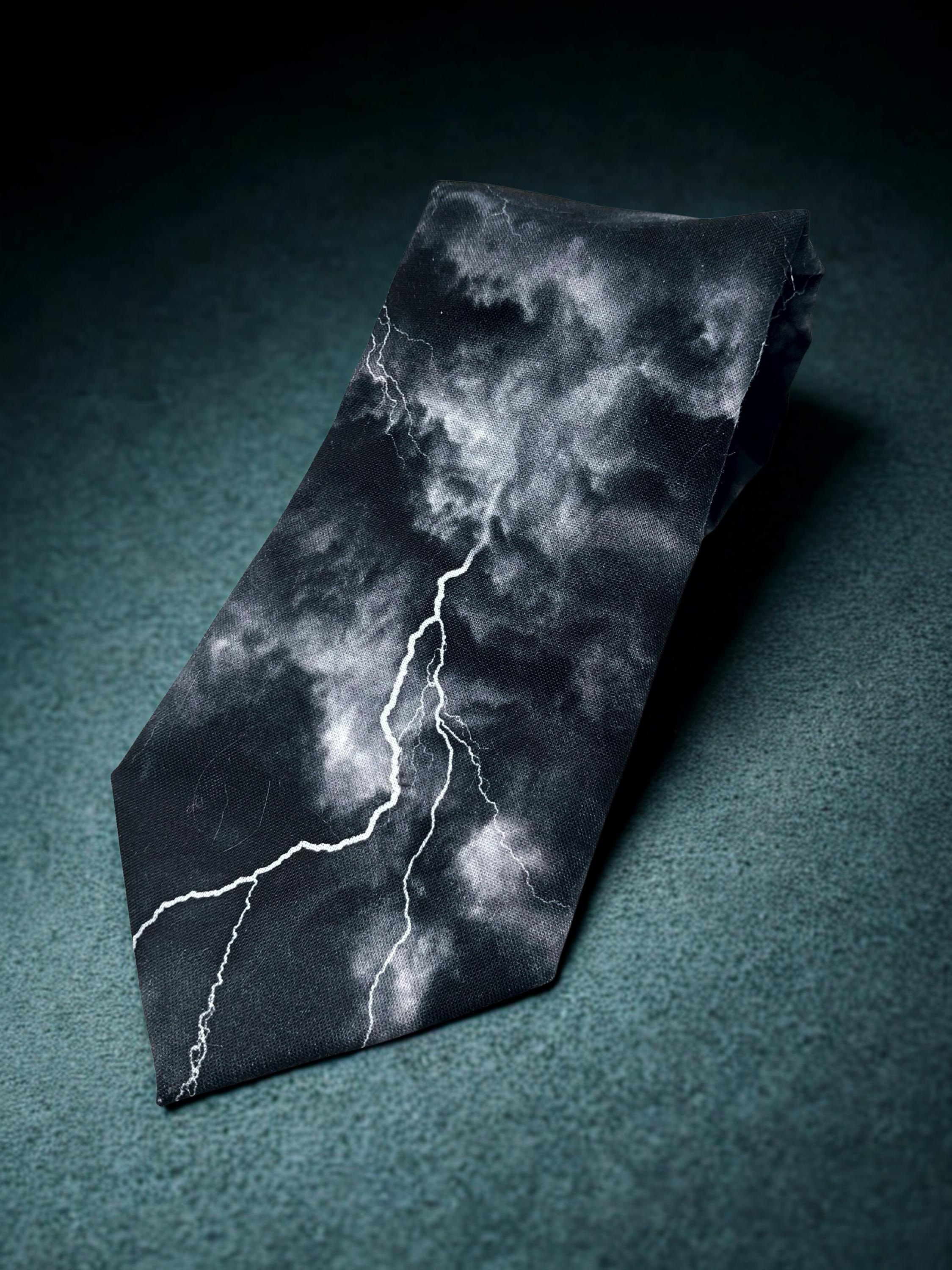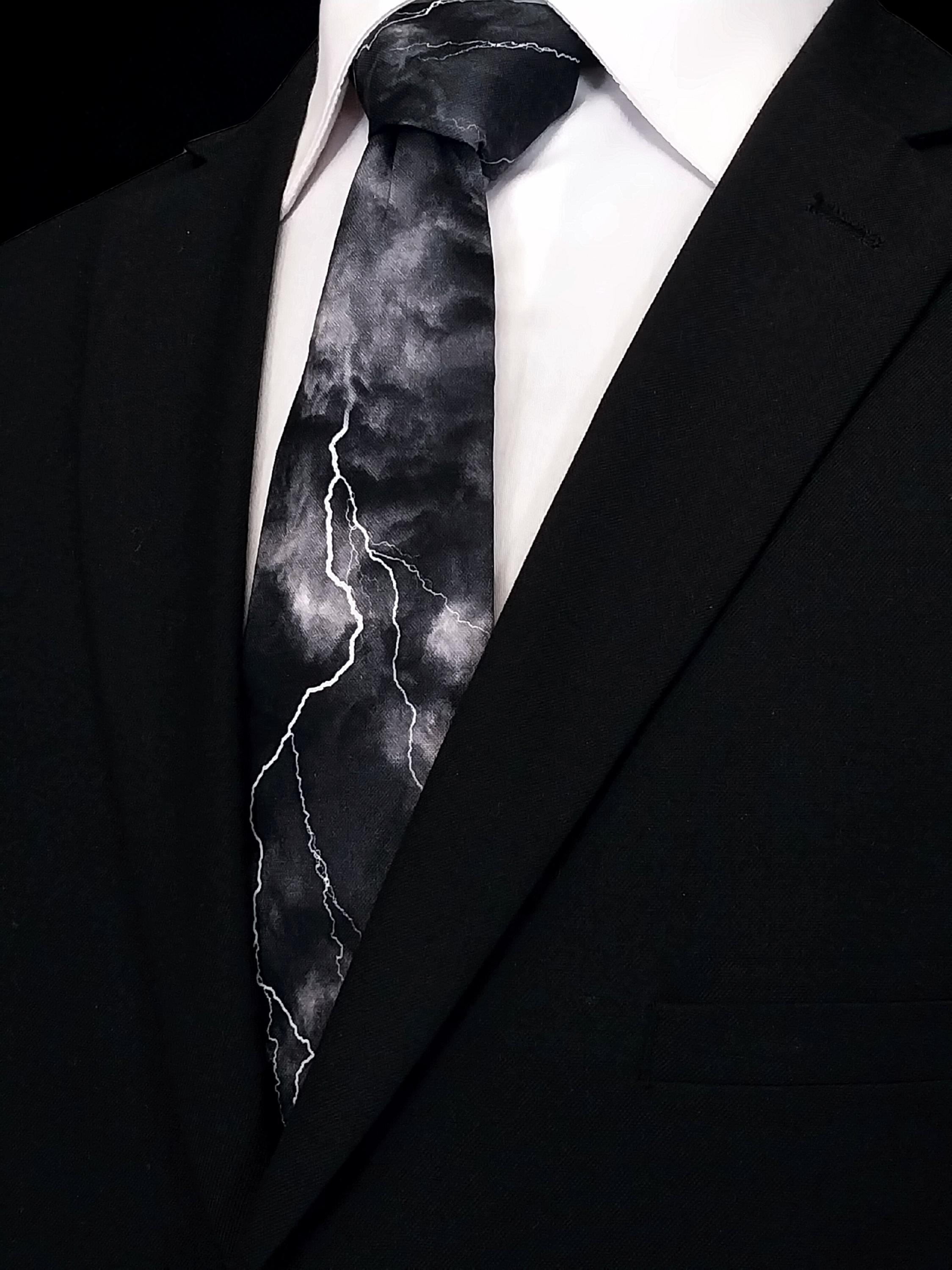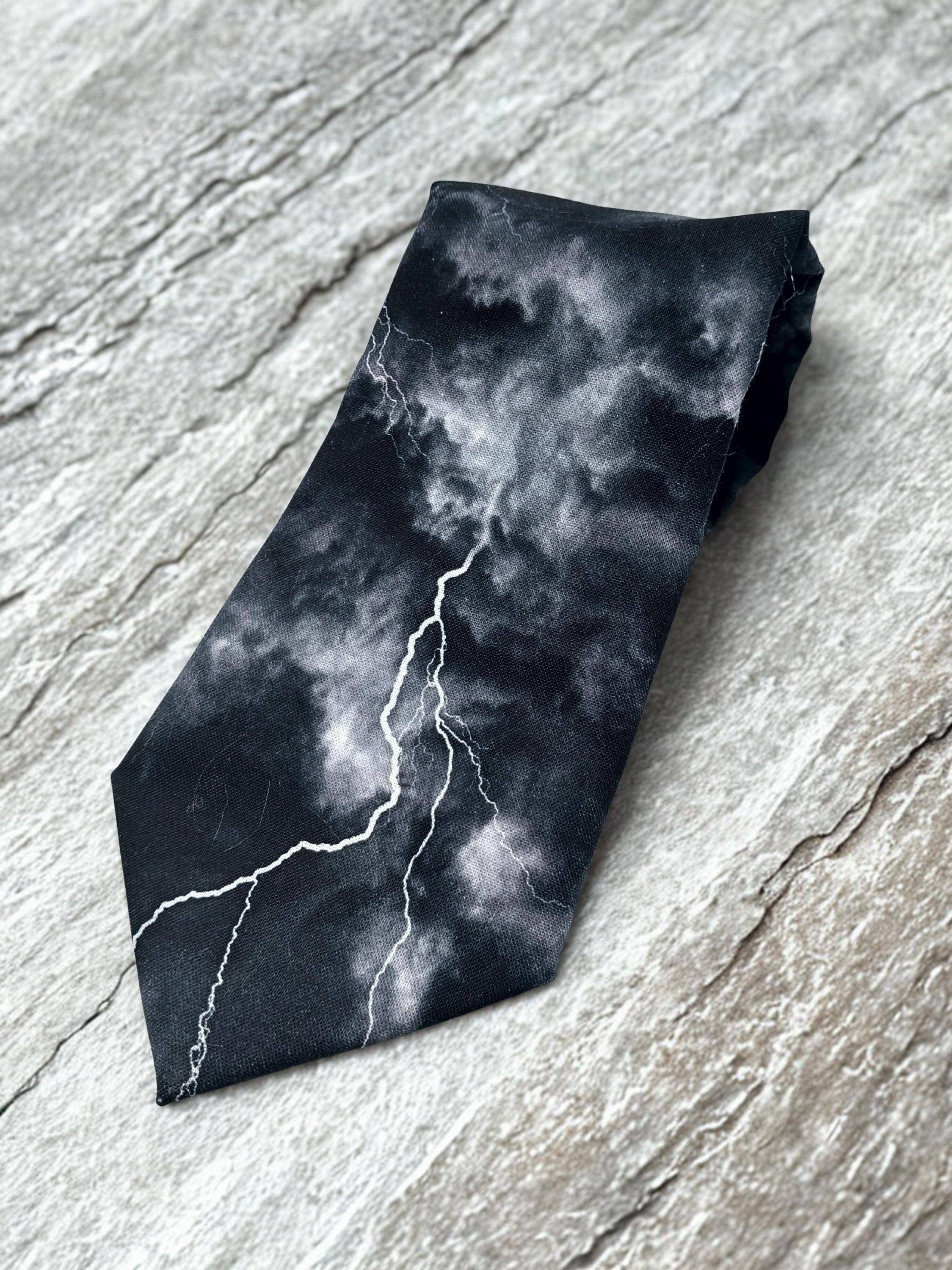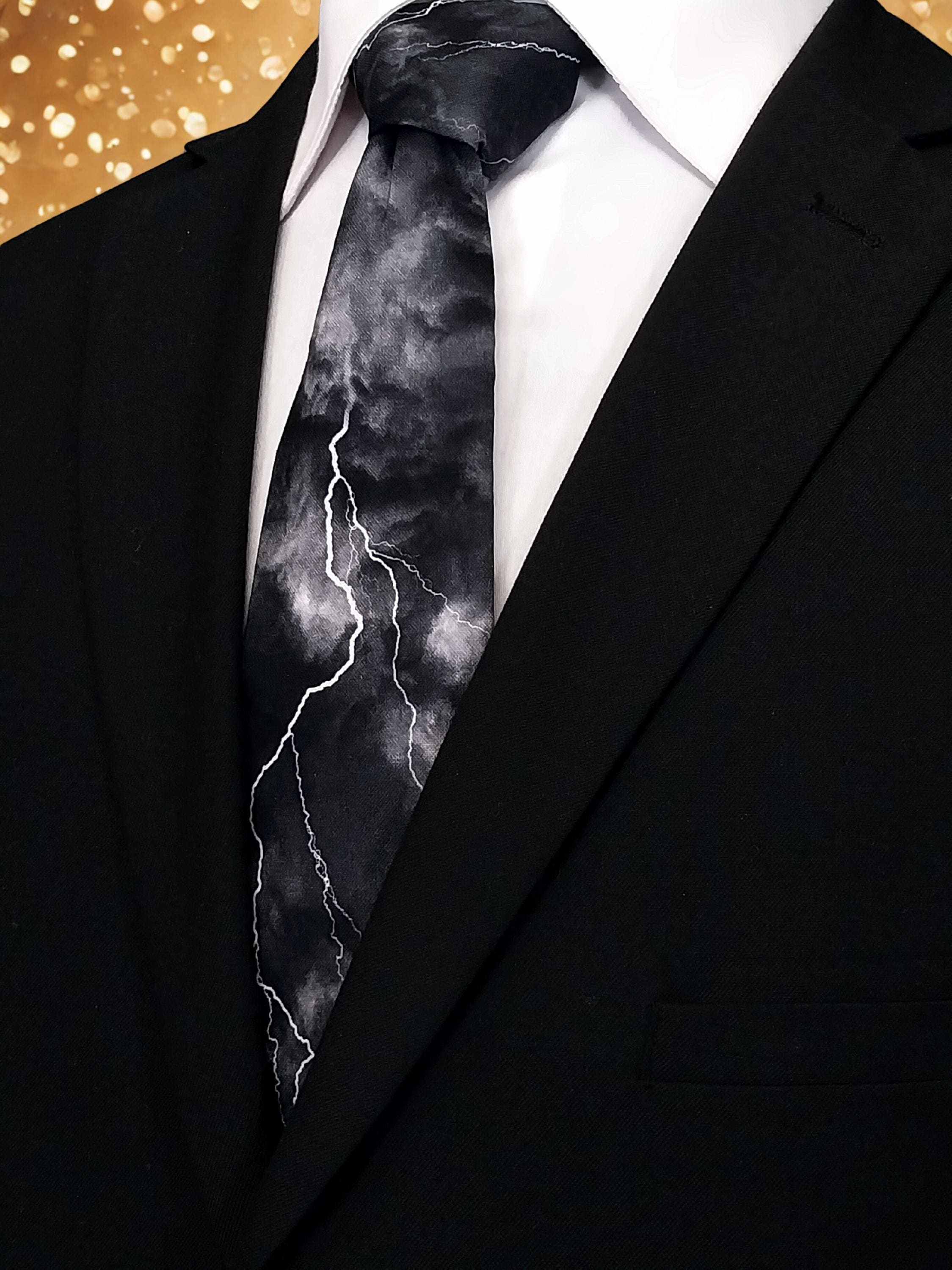 Perfect for a weatherman or the lighting bolt lover. Also available as a extra long tie. This lighting bolt tie features a black background with multiple lighting strikes.