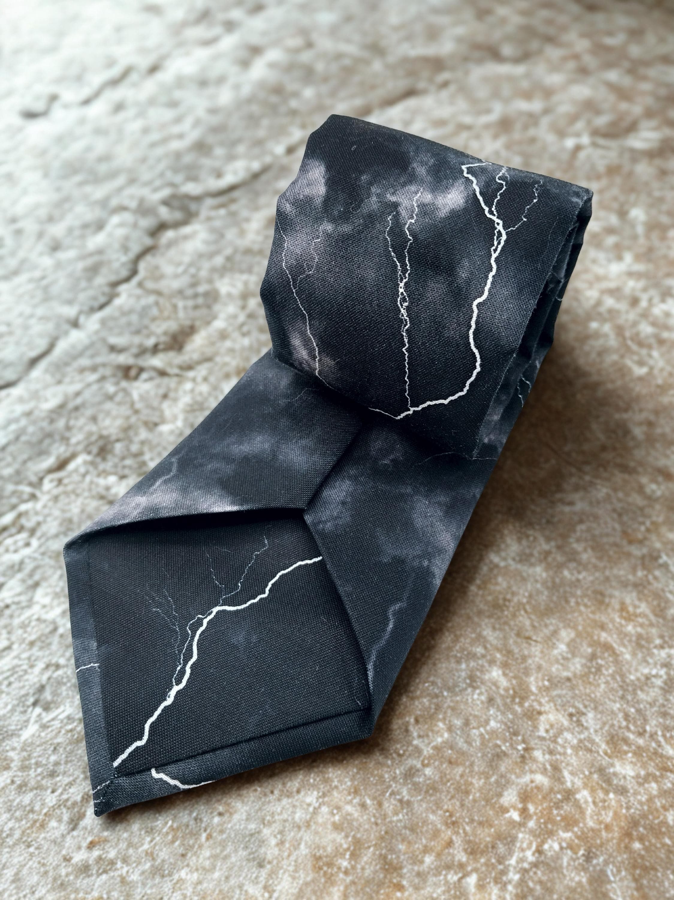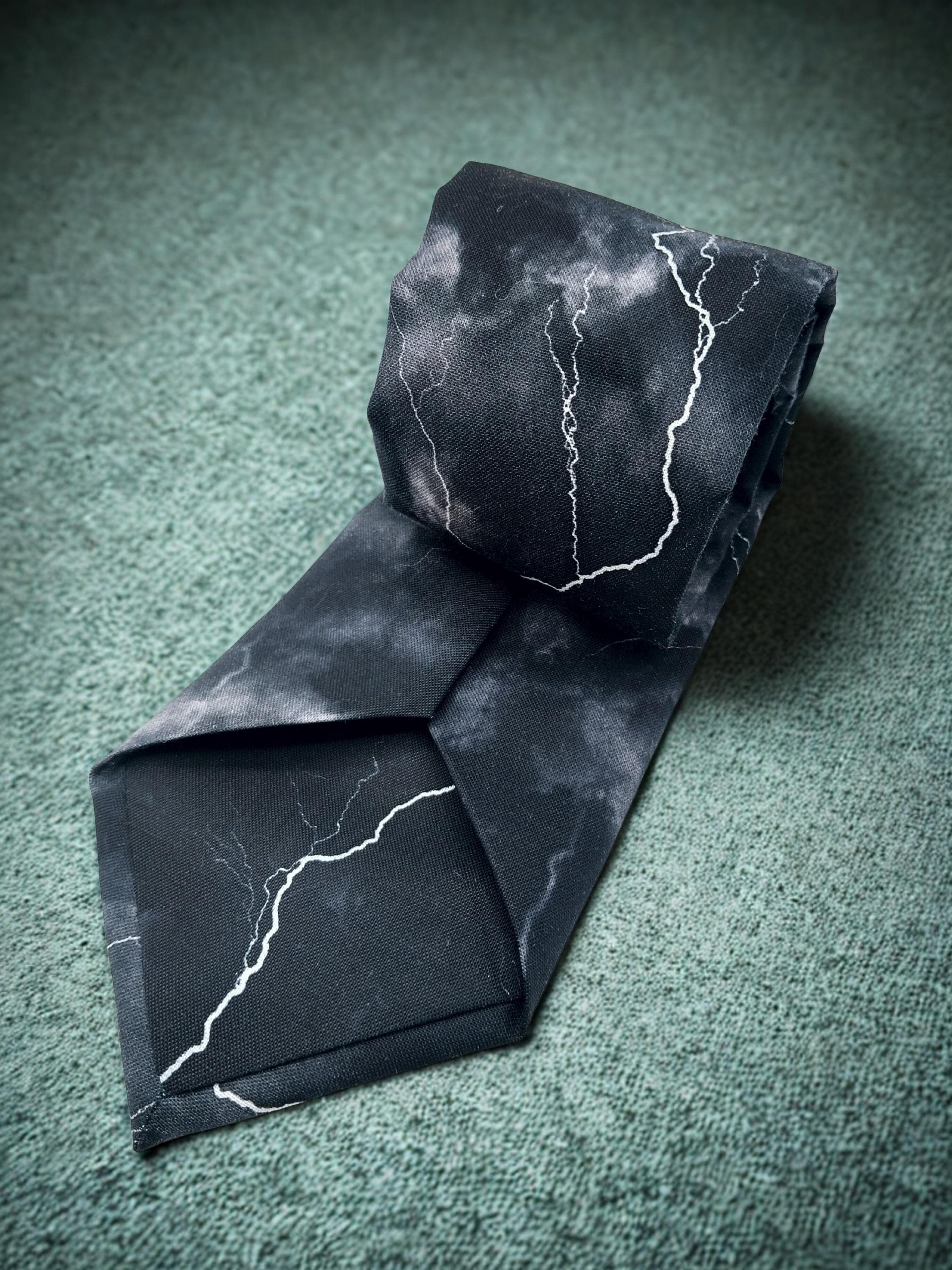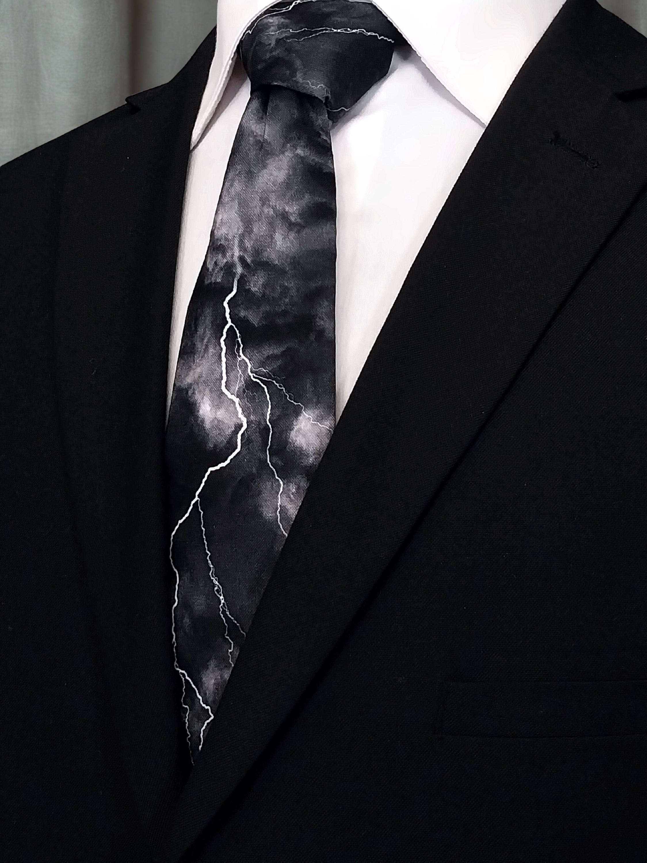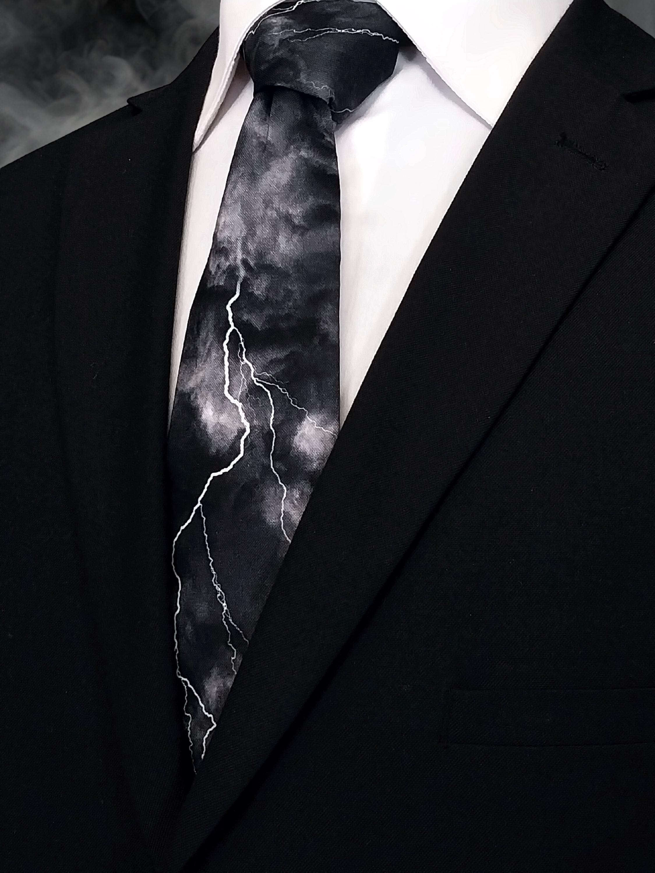 Perfect for a weatherman or the lighting bolt lover. Also available as a extra long tie. This lighting bolt tie features a black background with multiple lighting strikes.