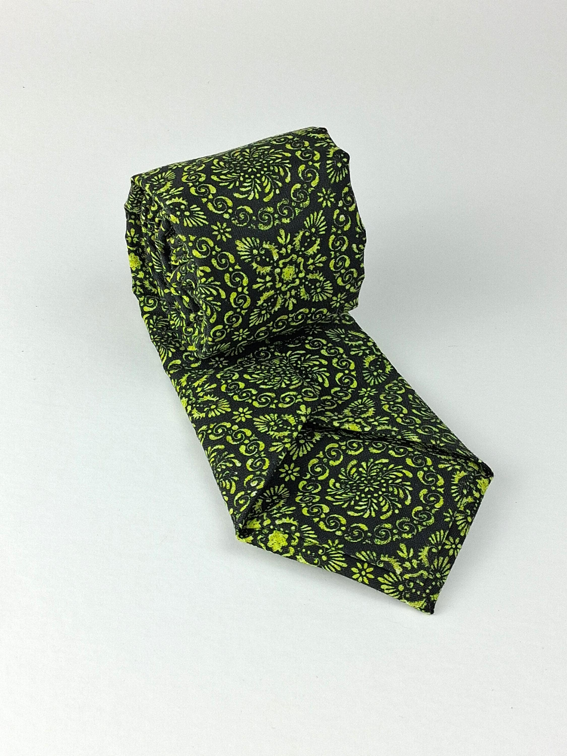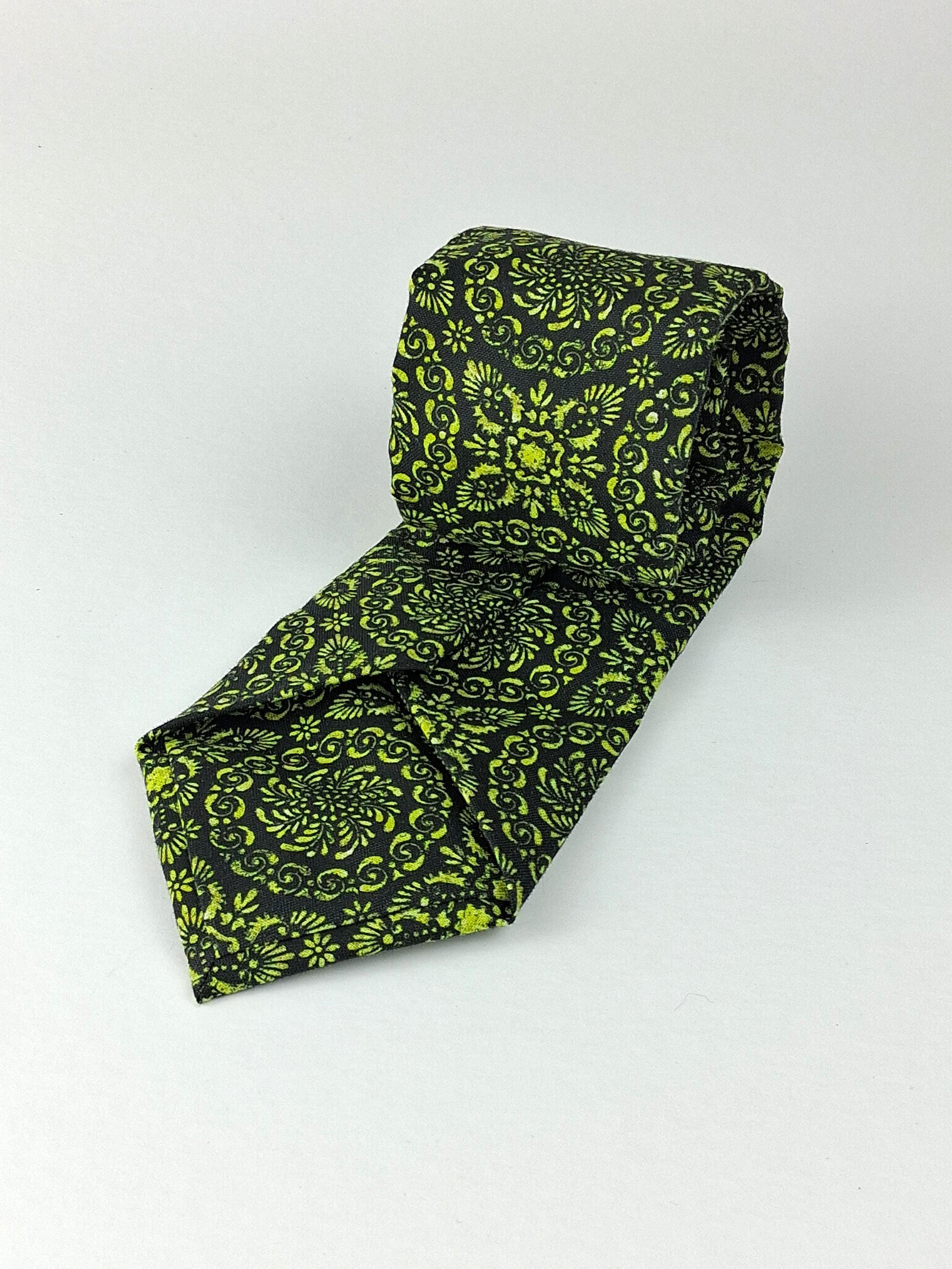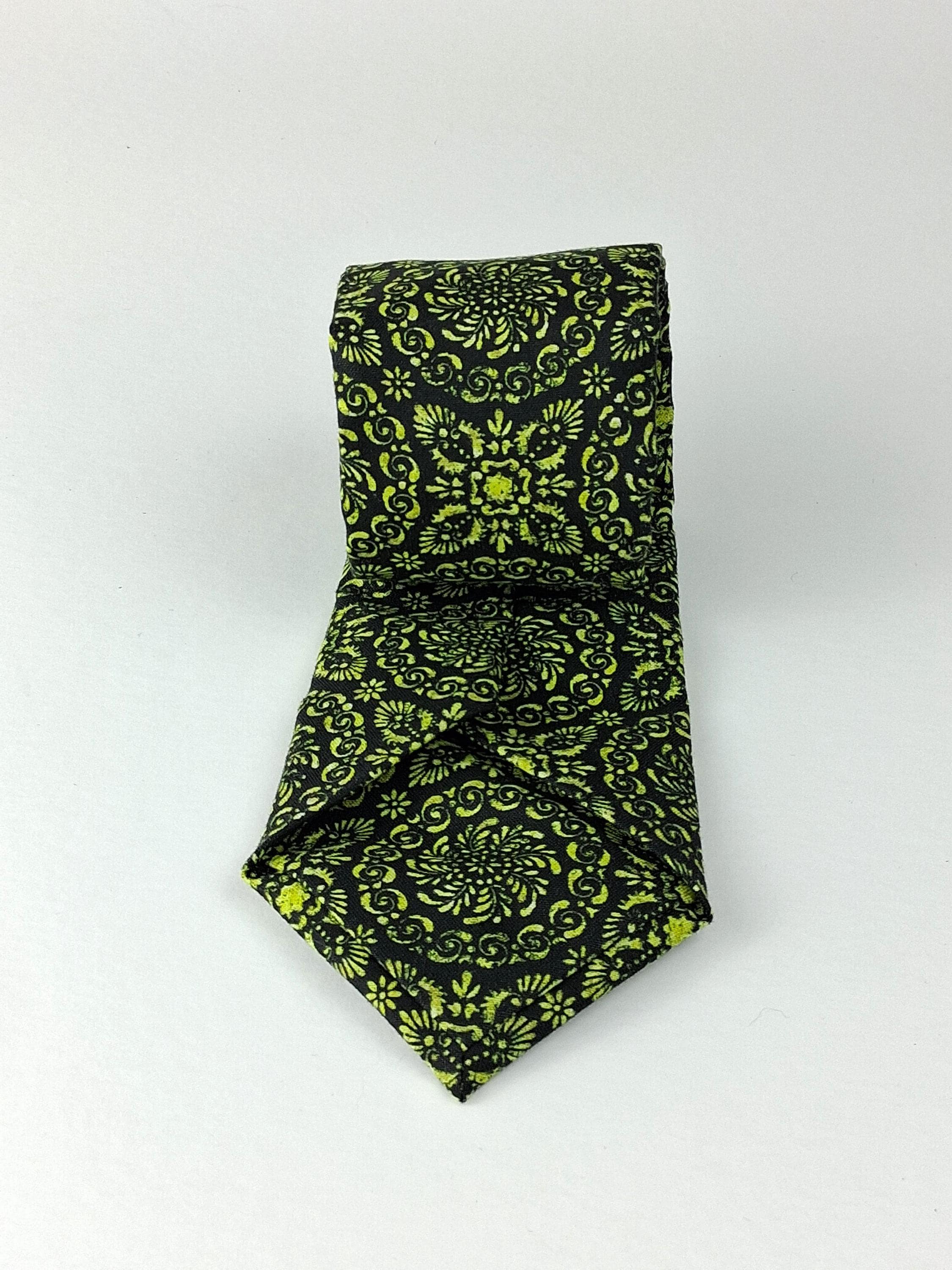Mens Black and gold formal neck tie. Features a black background with gold medallion pattern.