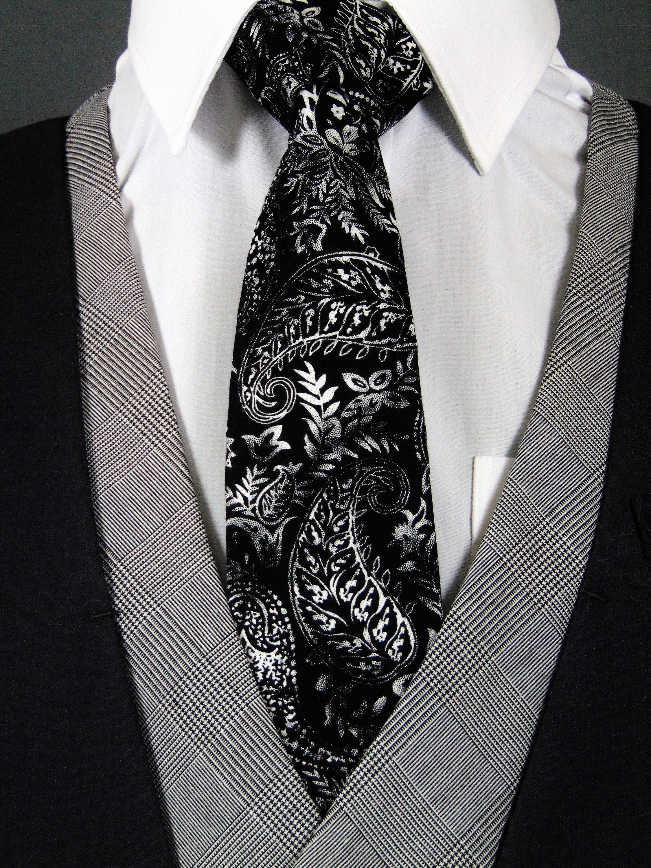 This stylish Black paisley tie is ideal if you are having a black and white wedding theme. Meticulously handmade from 100% cotton, it is a classic style that can be worn long after the big day. Select your length from 57" to 71" (great for taller men) and your width either 3.5" standard (as shown here) or 2.5" skinny. If you require a custom length or width, please contact us. FREE shipping on US orders. Made in the USA.