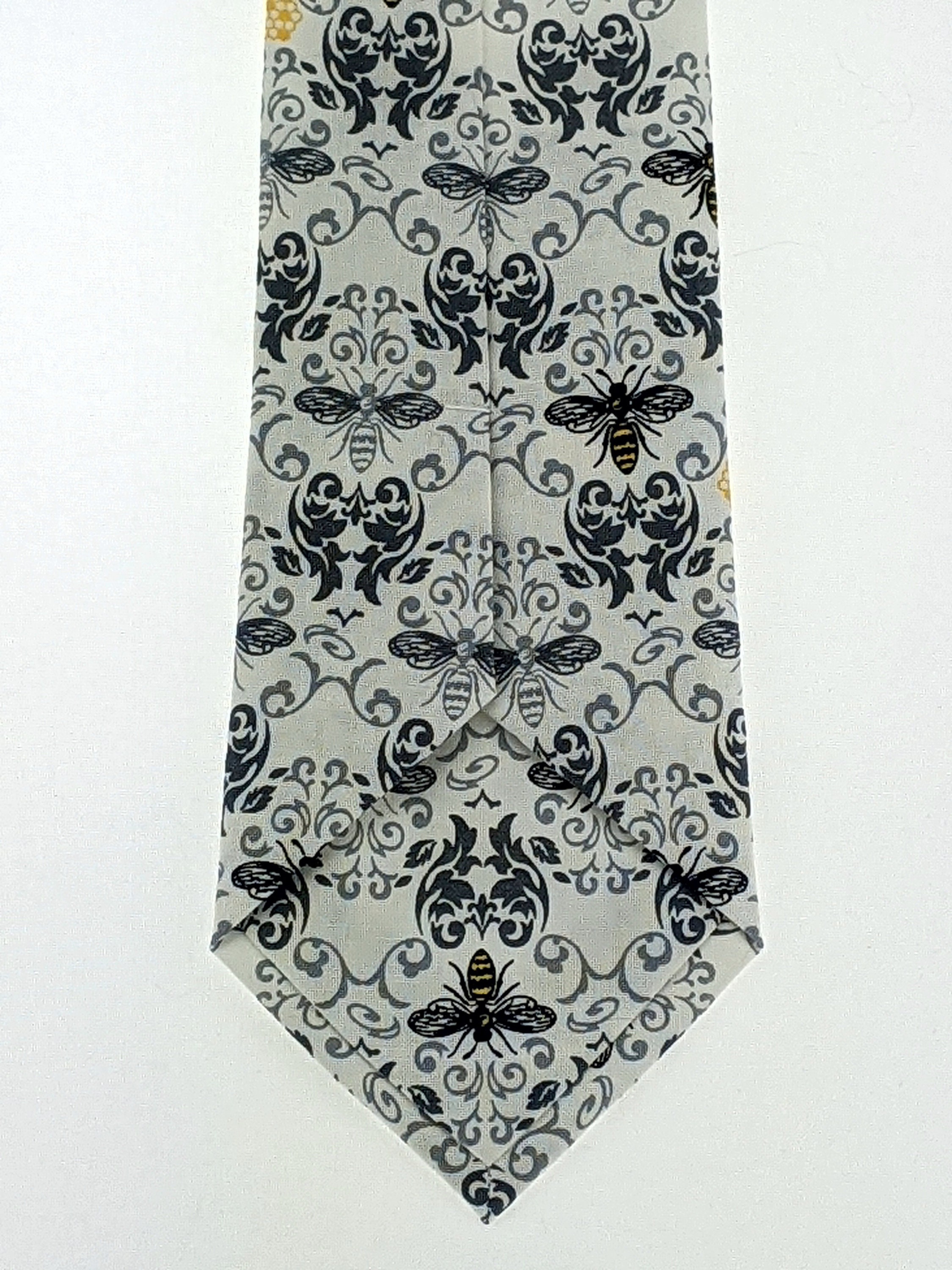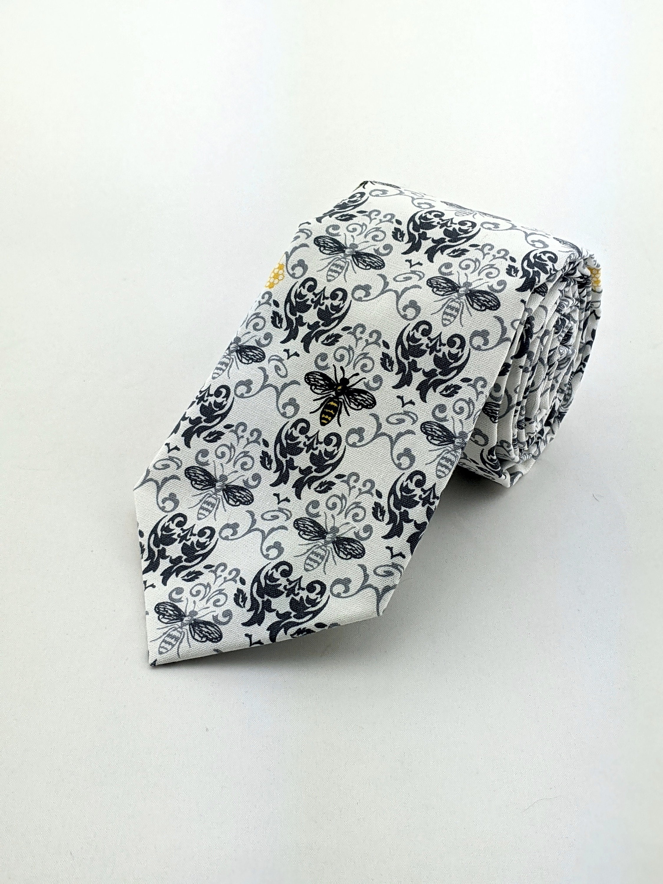 For the bee lover we are proud to offer this bee necktie. Features a white background subtle bee design. Colors include white, black, yellow, and grey. Available as an extra-long tie.
