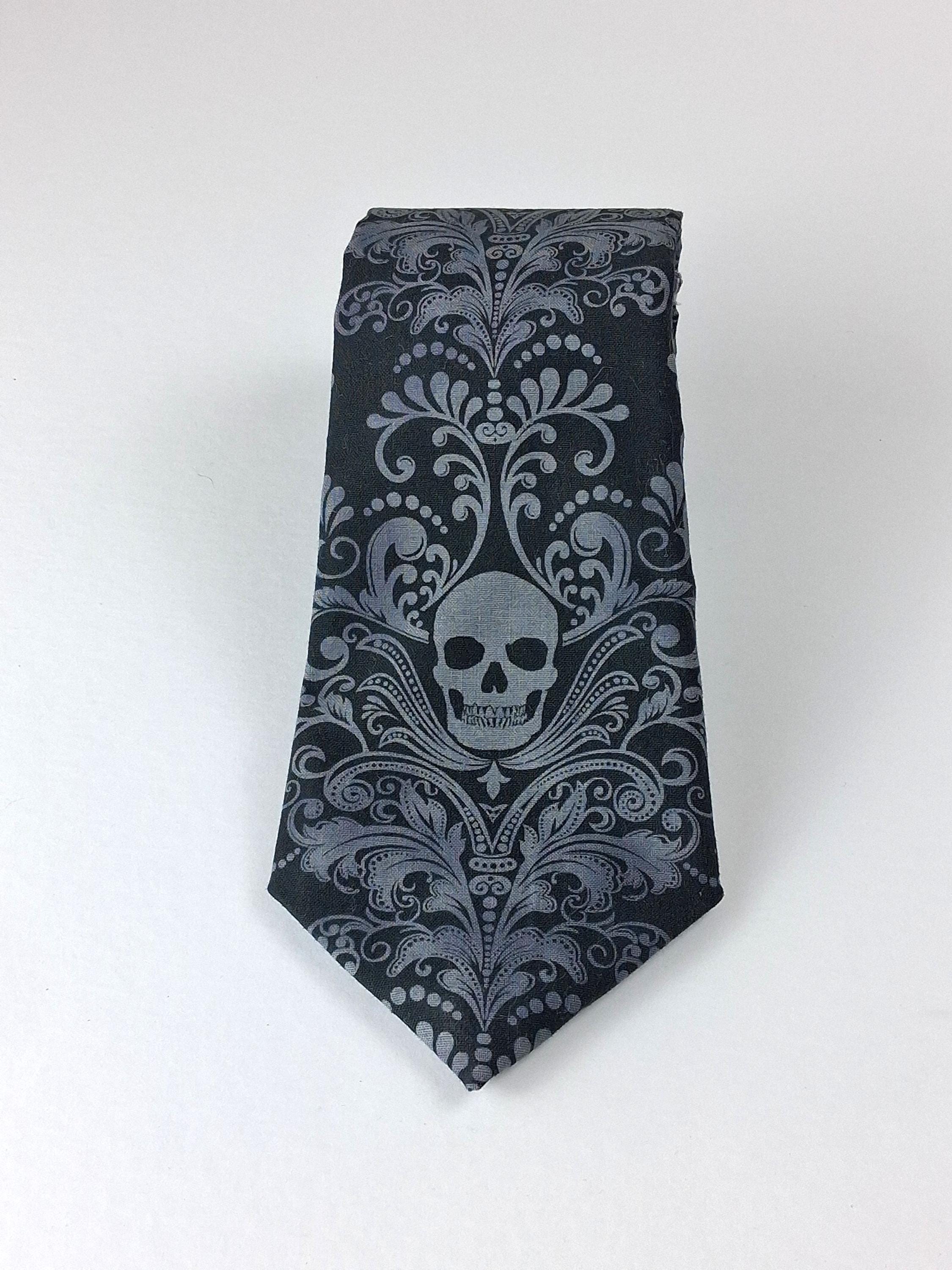 Black and Grey Skull Cotton Necktie | Handmade, Hand-dyed Men's Gothic Tie | Long or Slim