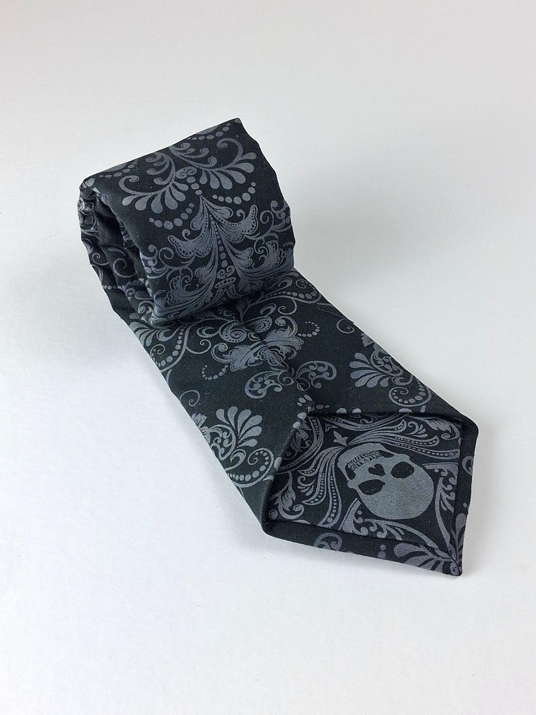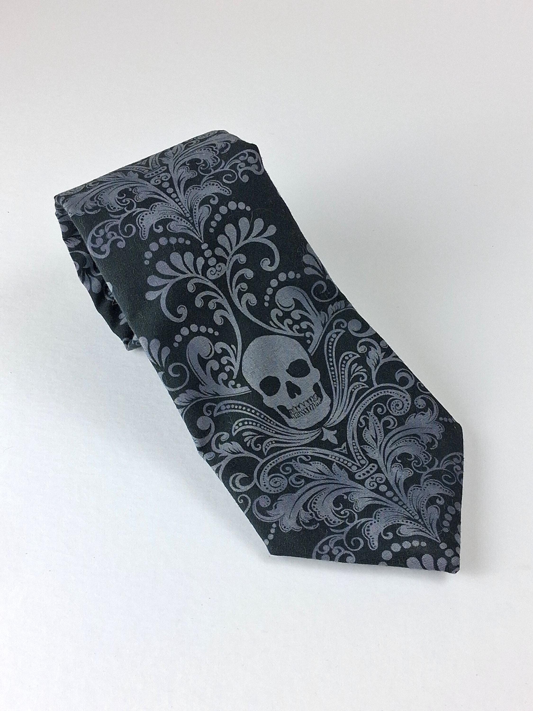This goth skull tie features a light Charcoal background with Grey skulls. Available as a skinny and an extra-long tie. Pocket squares available.