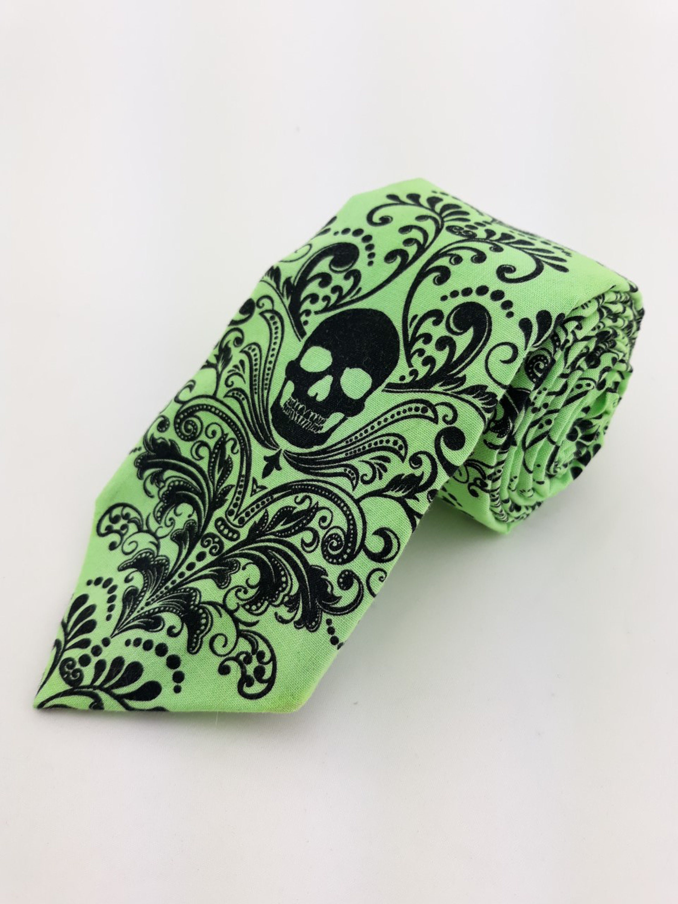 Hand dyed by Eds Neckties. This lime green skull tie features a light lime green background with black skulls. Available as a skinny and a extra long tie. Pocket sqaures available.