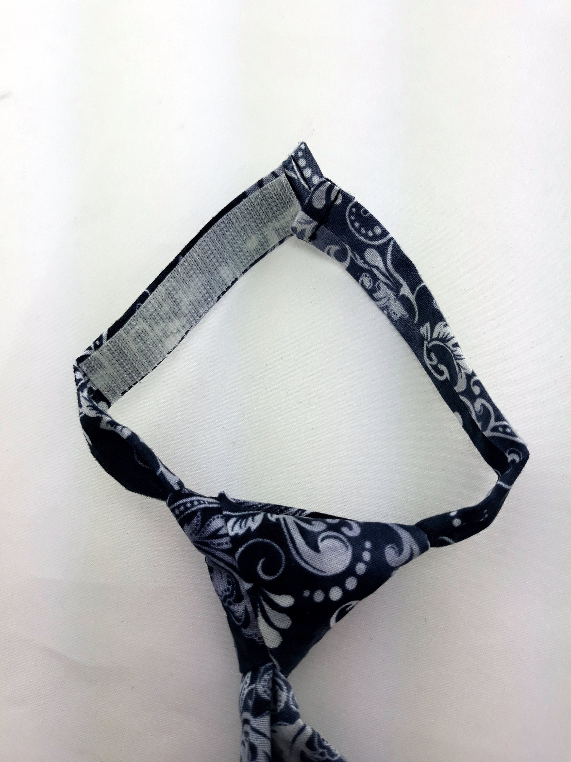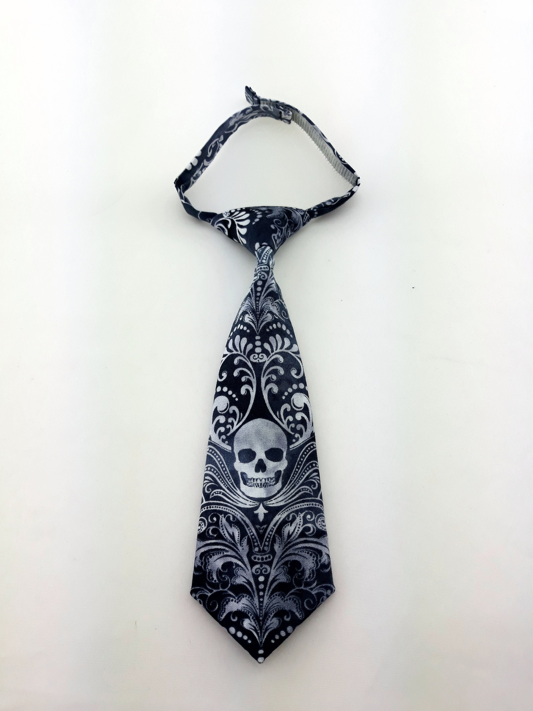 This is our first toddler skull necktie. This skull tie features a black / charcoal background with white skulls. Makes a great Halloween Tie The length from the tip of the tie to the top of the know is 9in and the width is 2.5in. The tie is pretied and the neck strap that measures 14in and connects with Velcro.